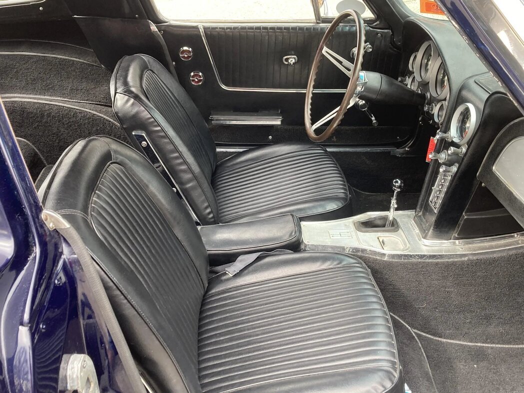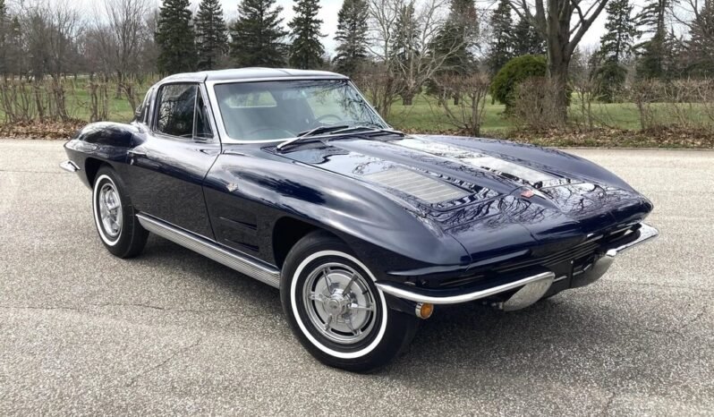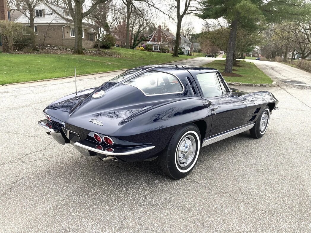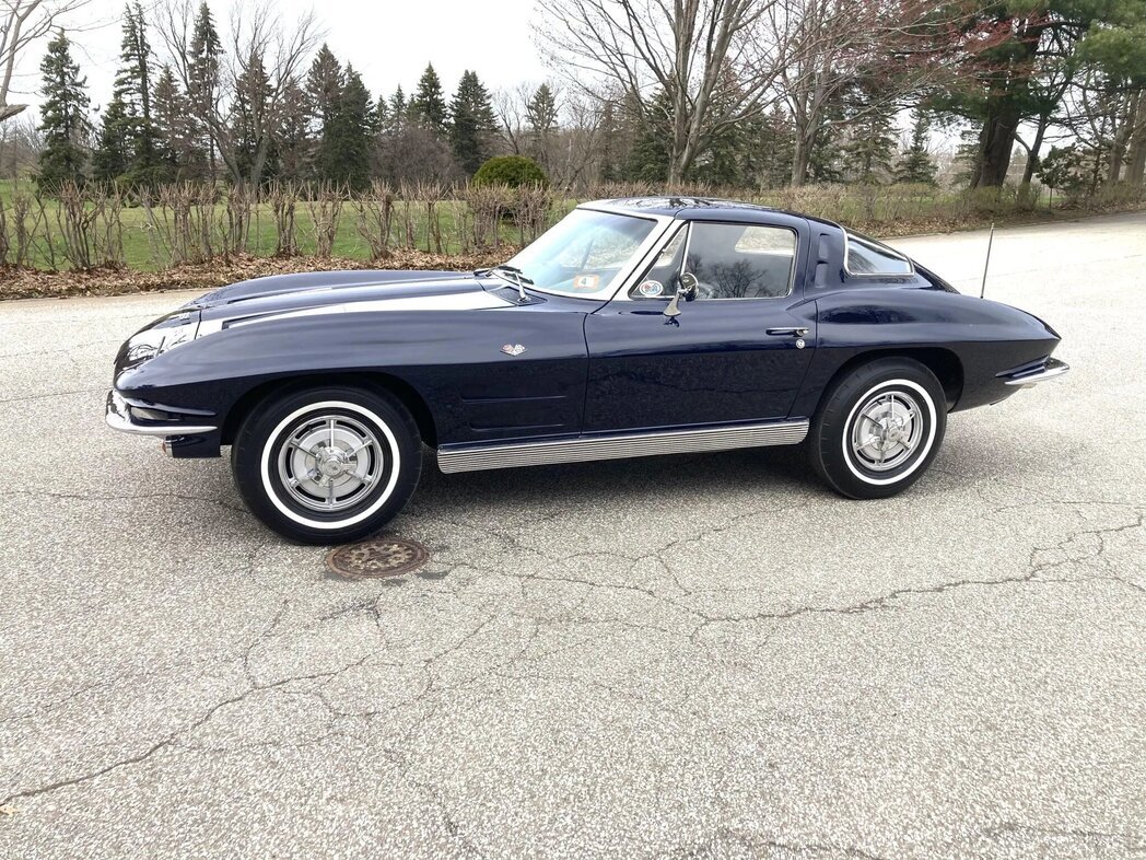 This 1963 Chevrolet Corvette is a split-window coupe finished in Daytona Blue over black vinyl and powered by a replacement 350ci V8 paired with a four-speed manual transmission.