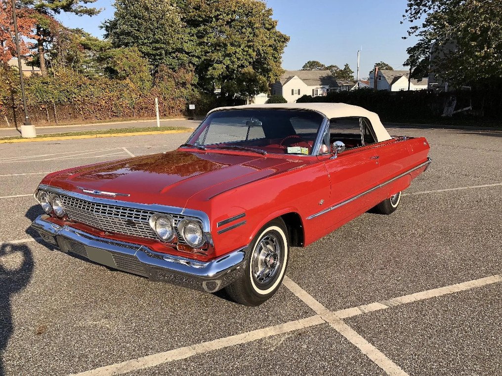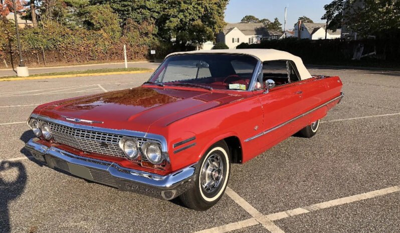 This 1963 Chevrolet Impala SS convertible was refurbished, and power comes from a 327ci V8 paired with a two-speed Powerglide automatic transmission, and additional equipment includes a white soft top, 14” wheels, fender skirts, chrome bumpers, engine-turned bright metal accents, an AM/FM cassette stereo, and power steering and brakes. Subsequent work have included a carburetor rebuild and replacement of the fuel tank, exhaust system, and convertible top lift cylinders.