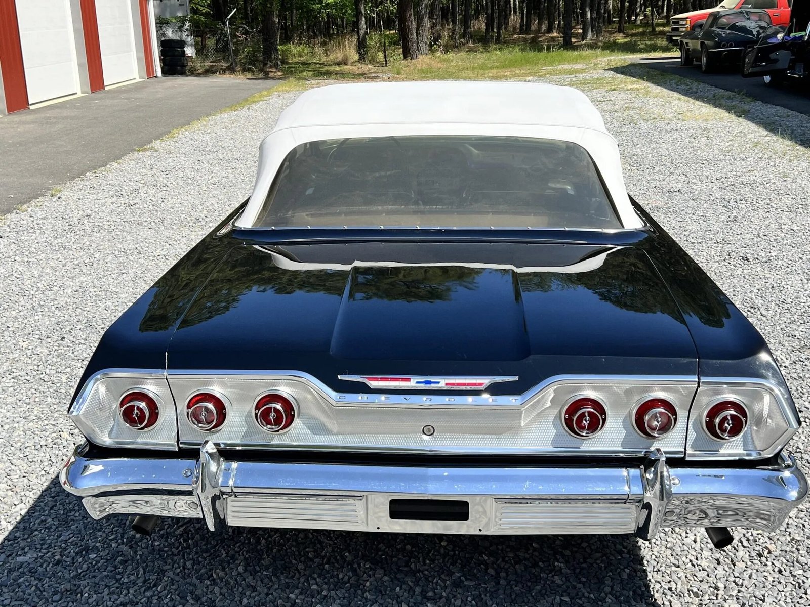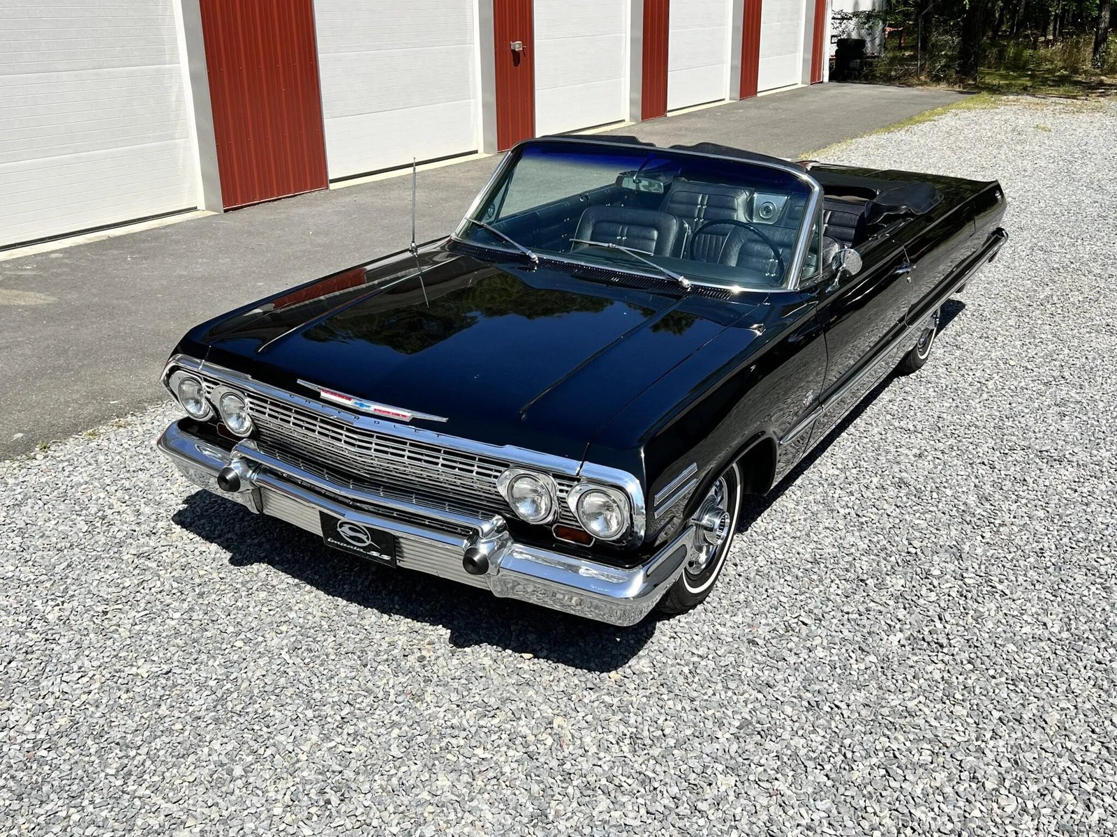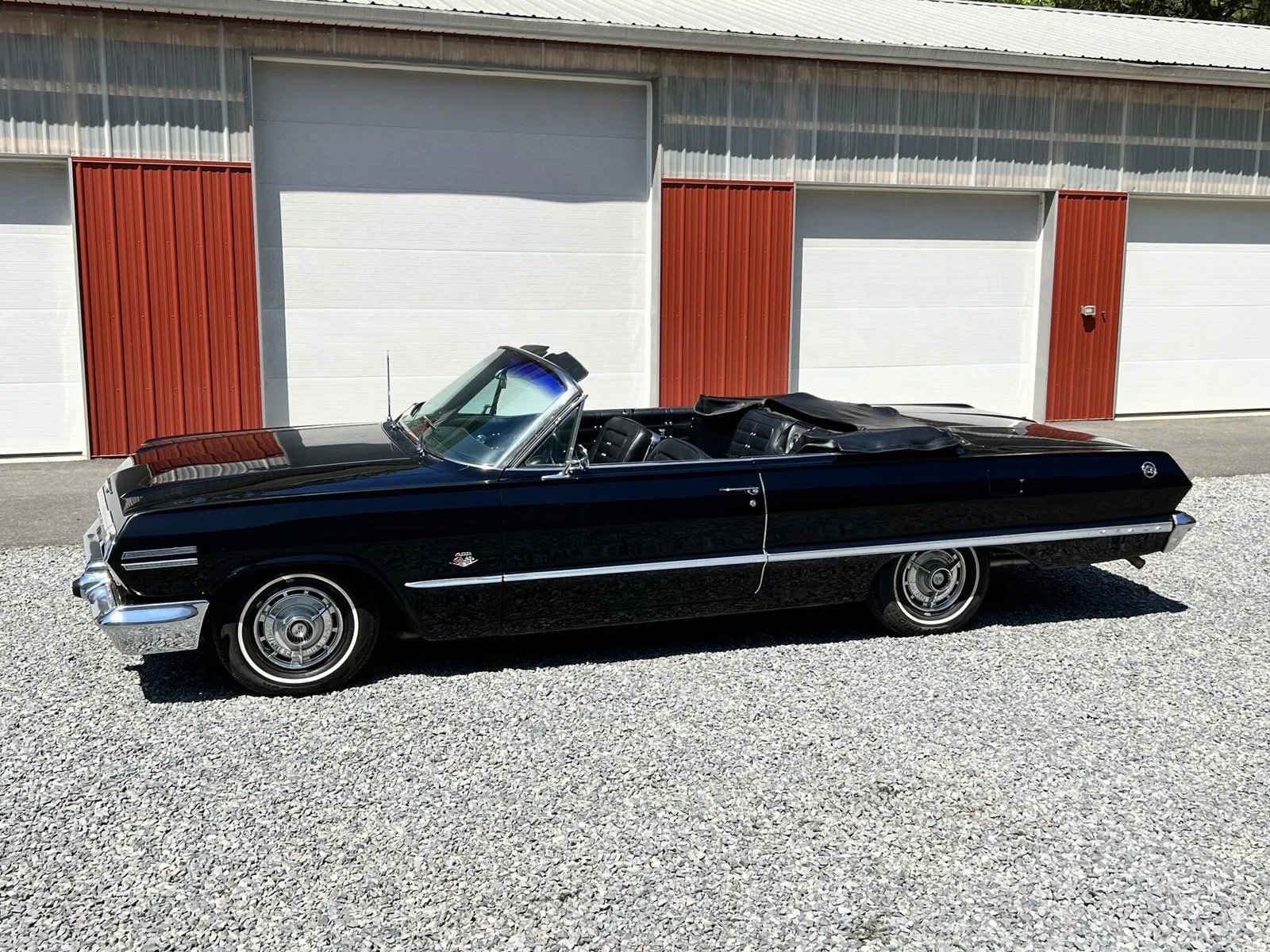 The car is finished in black and features include a power-operated white soft top, quad headlamps, SS Impala and 409 badging, polished trim, an engine-turned aluminum tail panel, chrome bumpers, and a dual exhaust system.