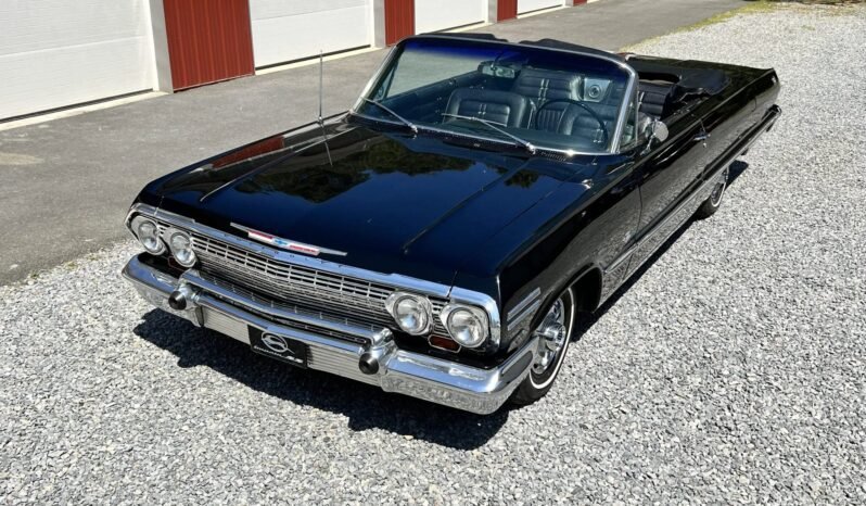 This 1963 Chevrolet Impala SS convertible is powered by a replacement 409ci V8 mated to a four-speed manual transmission and is finished in black over black vinyl upholstery. Equipment includes two four-barrel carburetors, a power-operated white convertible top, 14″ steel wheels, power steering and brakes, a PerTronix Flame-Thrower ignition coil, aftermarket air conditioning, a center console, front bucket seats, power windows, and a Delco AM radio.