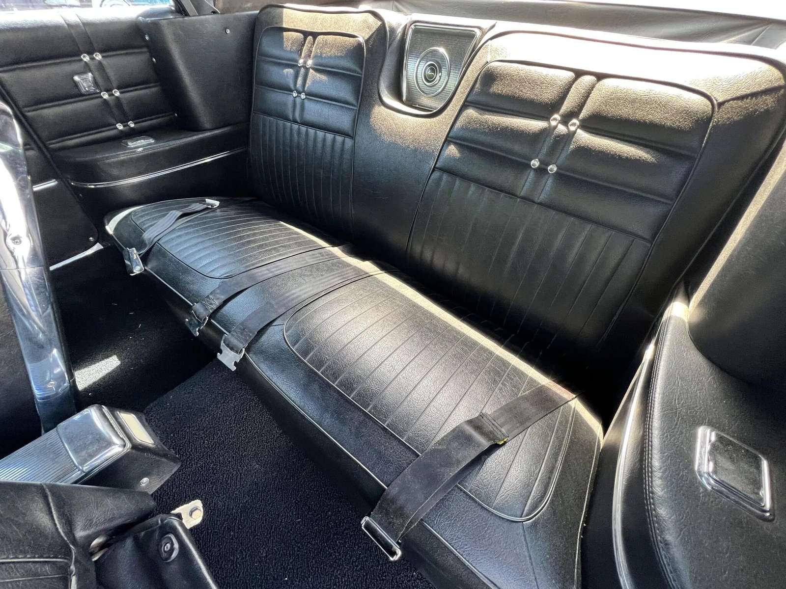 The front bucket seats and rear bench are upholstered in black vinyl, and engine-turned trim is present on the dashboard and instrument cluster.