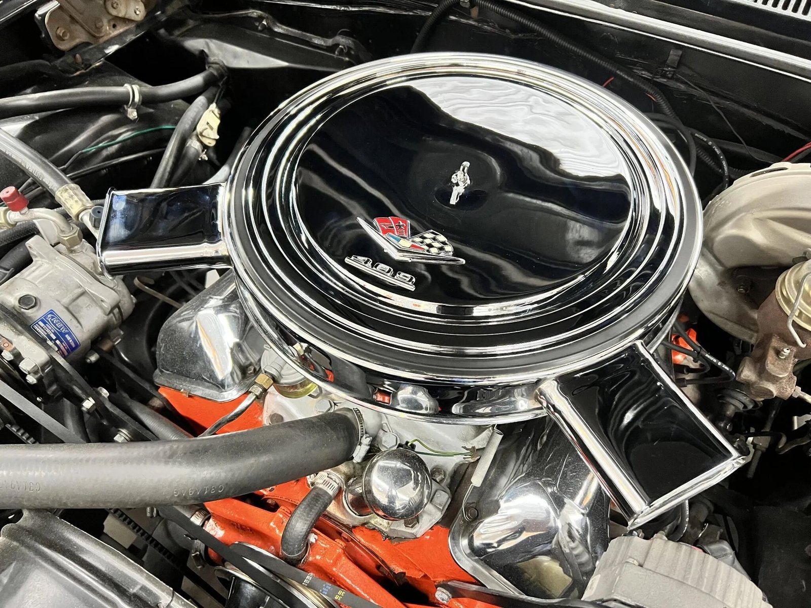 The replacement 409ci V8 features a PerTronix Flame-Thrower ignition coil, dual four-barrel carburetors, and a chrome air cleaner assembly and valve covers.