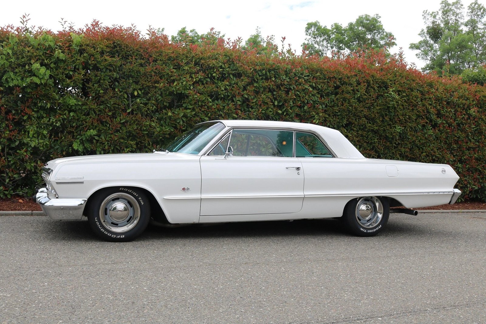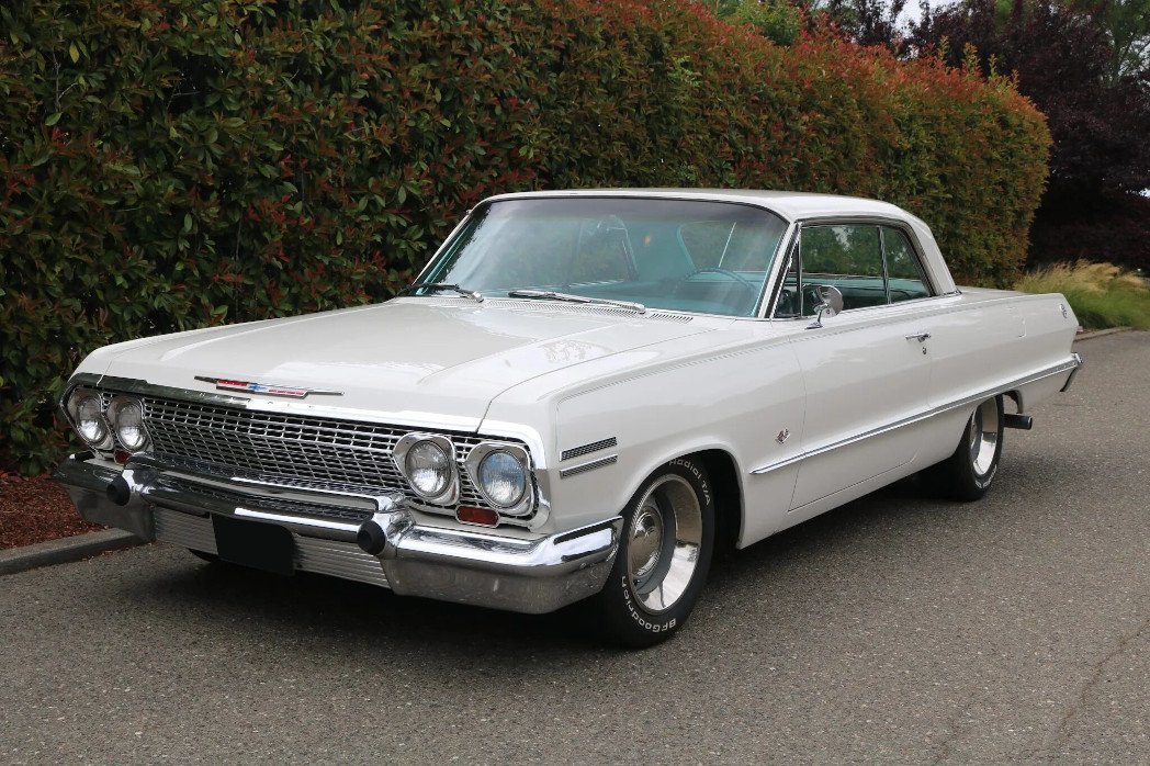 This 1963 Chevrolet Impala SS Sport Coupe 327 is finished in white over aqua vinyl upholstery and is powered by a 327ci V8 paired with a Powerglide two-speed automatic transmission.