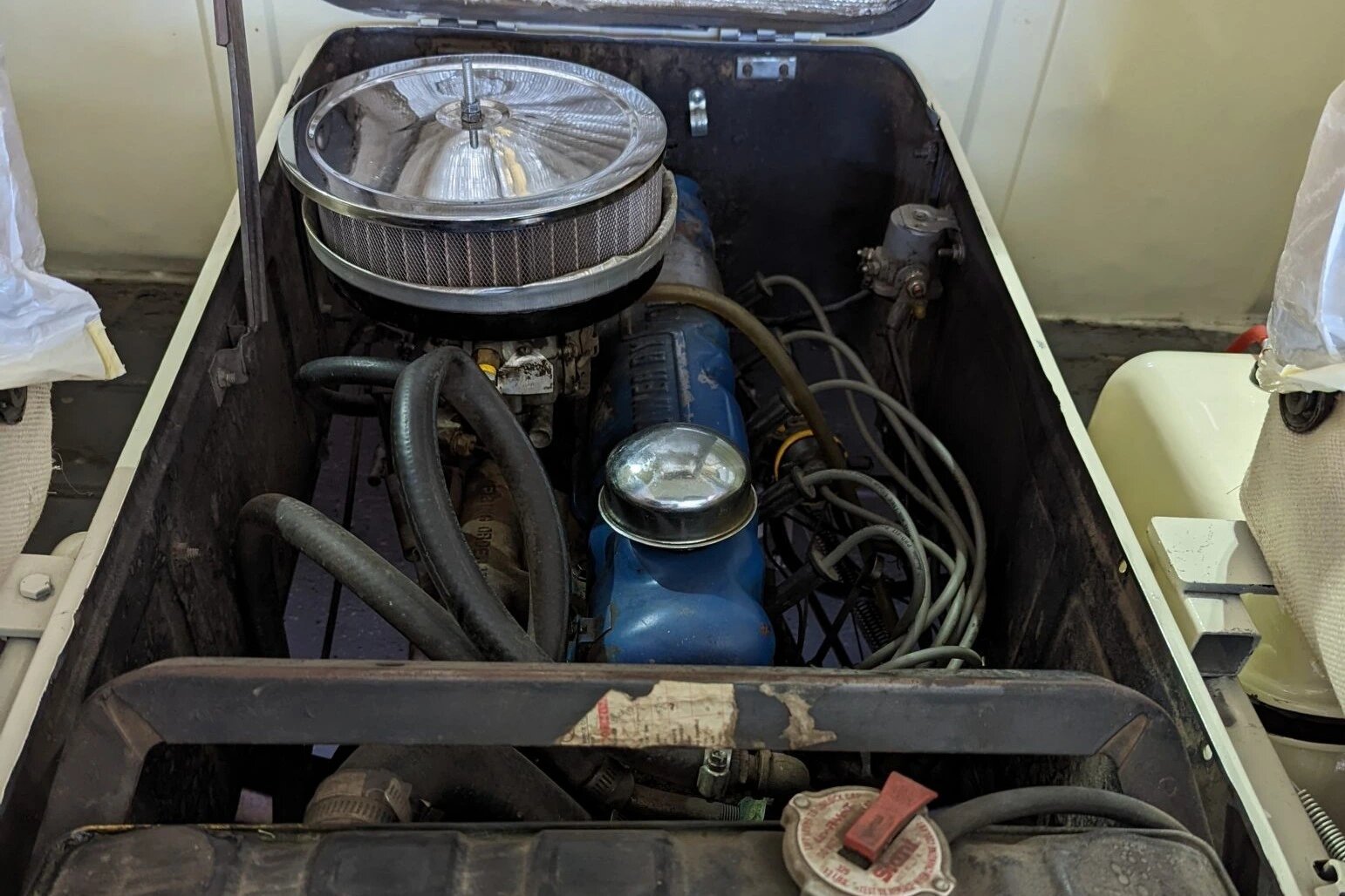The cabin features bucket seats upholstered in white vinyl along with with a color-coordinated engine cover, dashboard, and door panels.