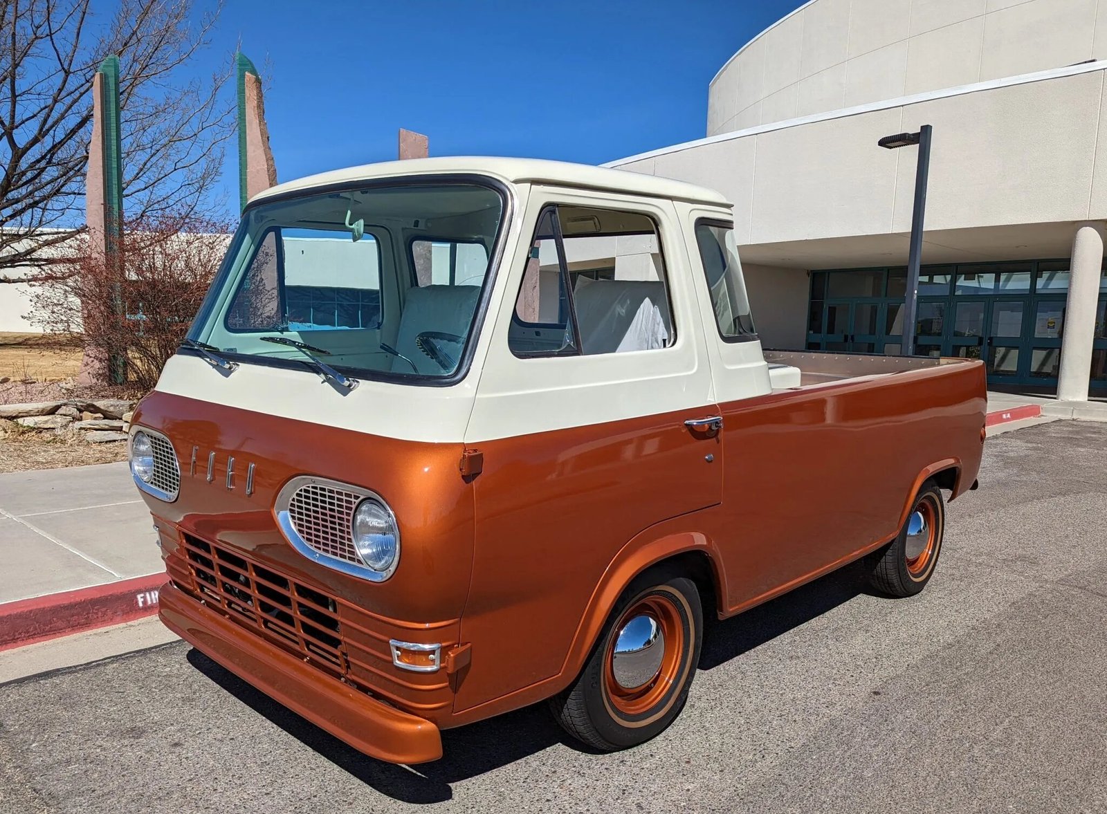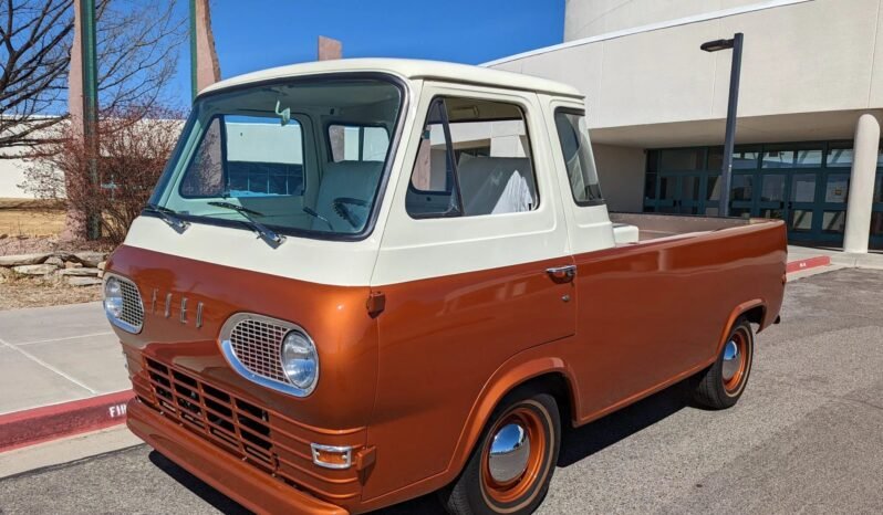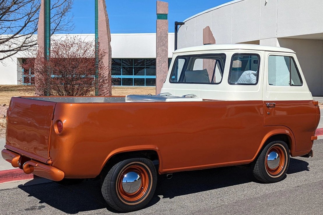 This 1963 Ford Econoline E-100 pickup is finished in two-tone orange and cream over a white vinyl interior and is powered by a 170ci inline-six linked with a column-shifted three-speed manual transmission.