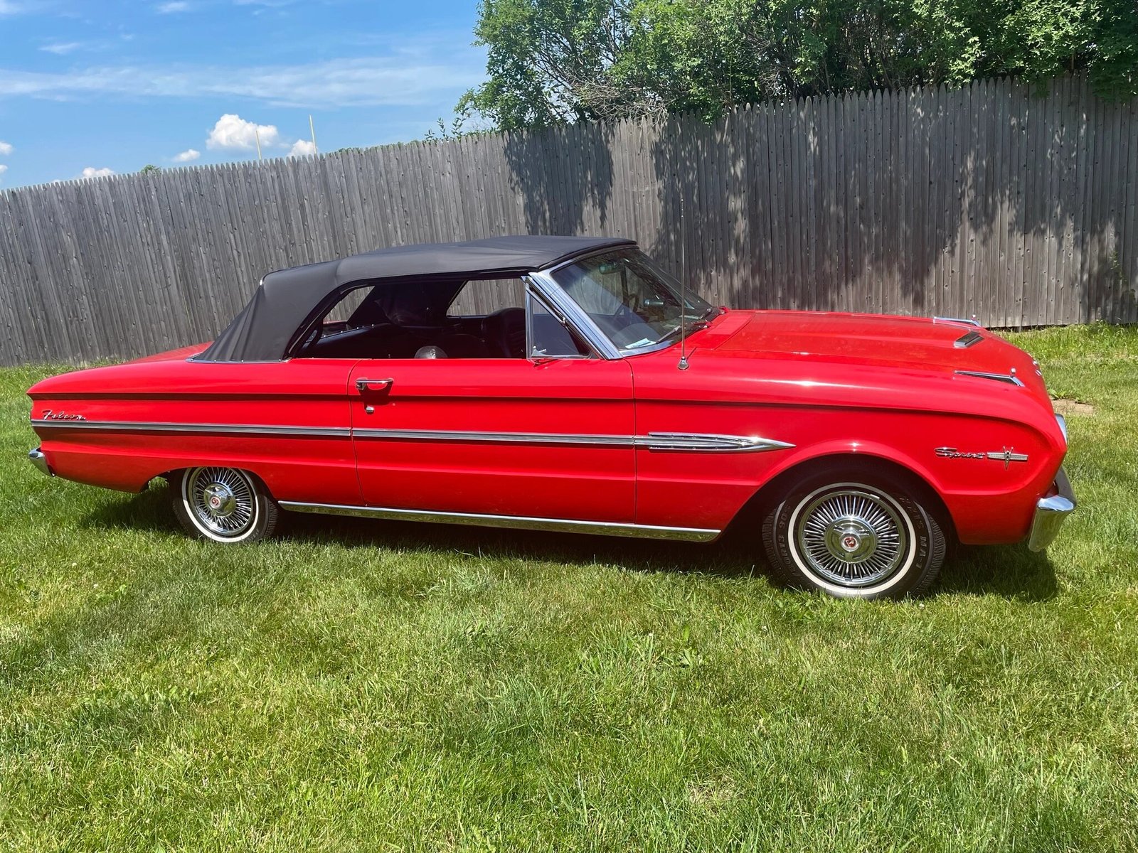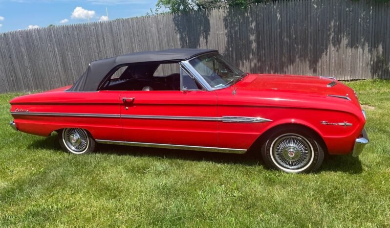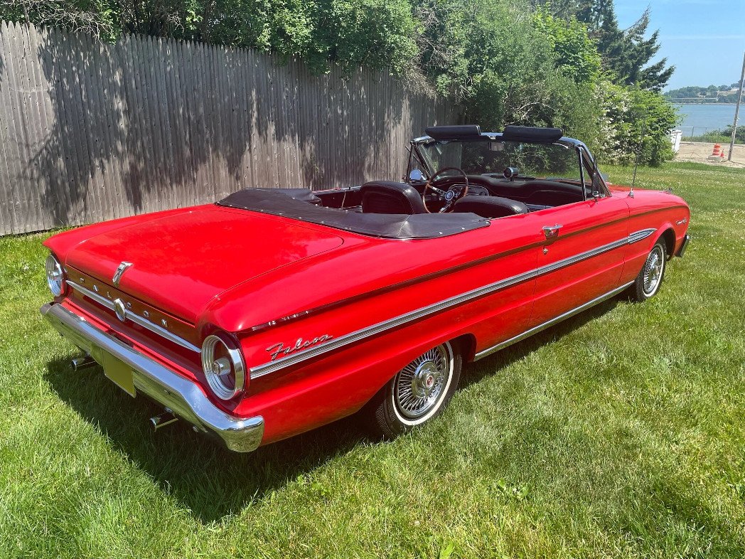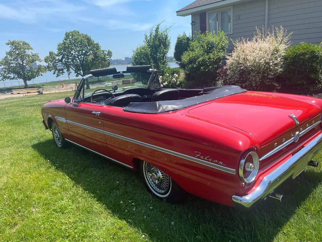 This 1963 Ford Falcon Sprint convertible is finished in red over black vinyl upholstery and is powered by a 260ci V8 paired with a five-speed manual transmission.