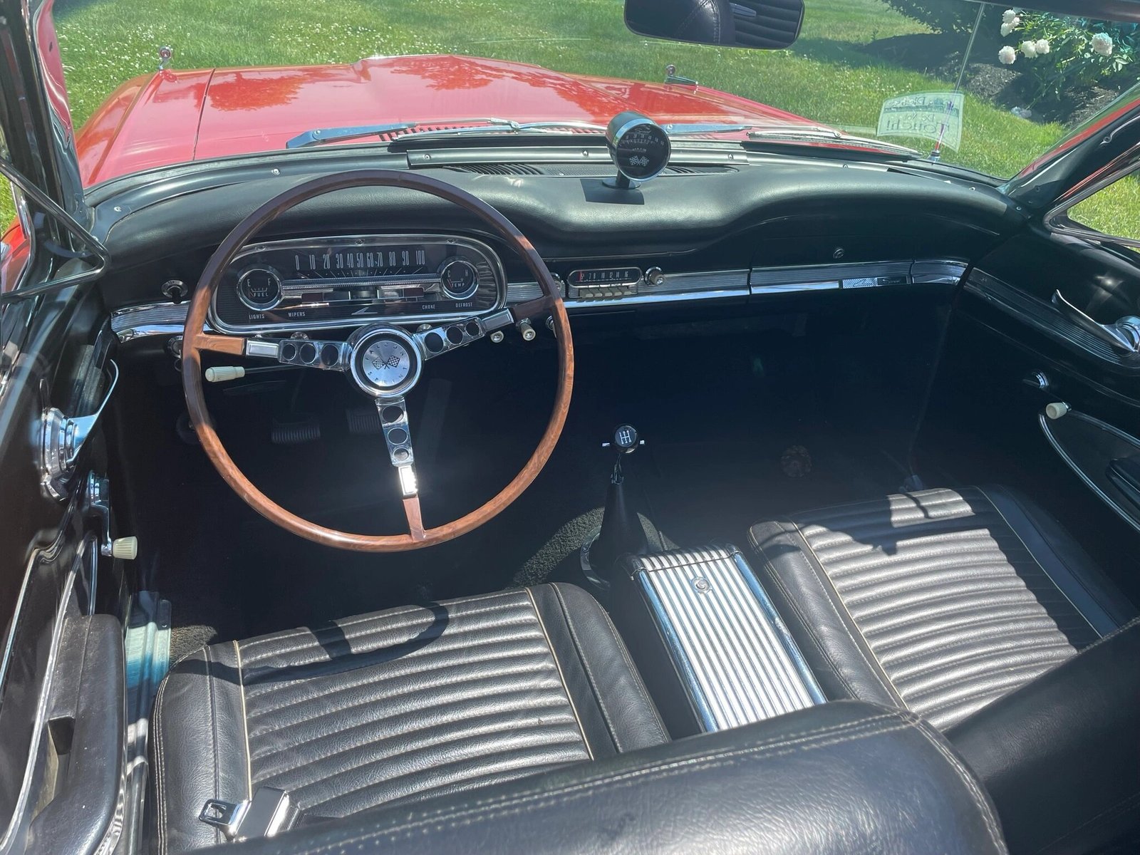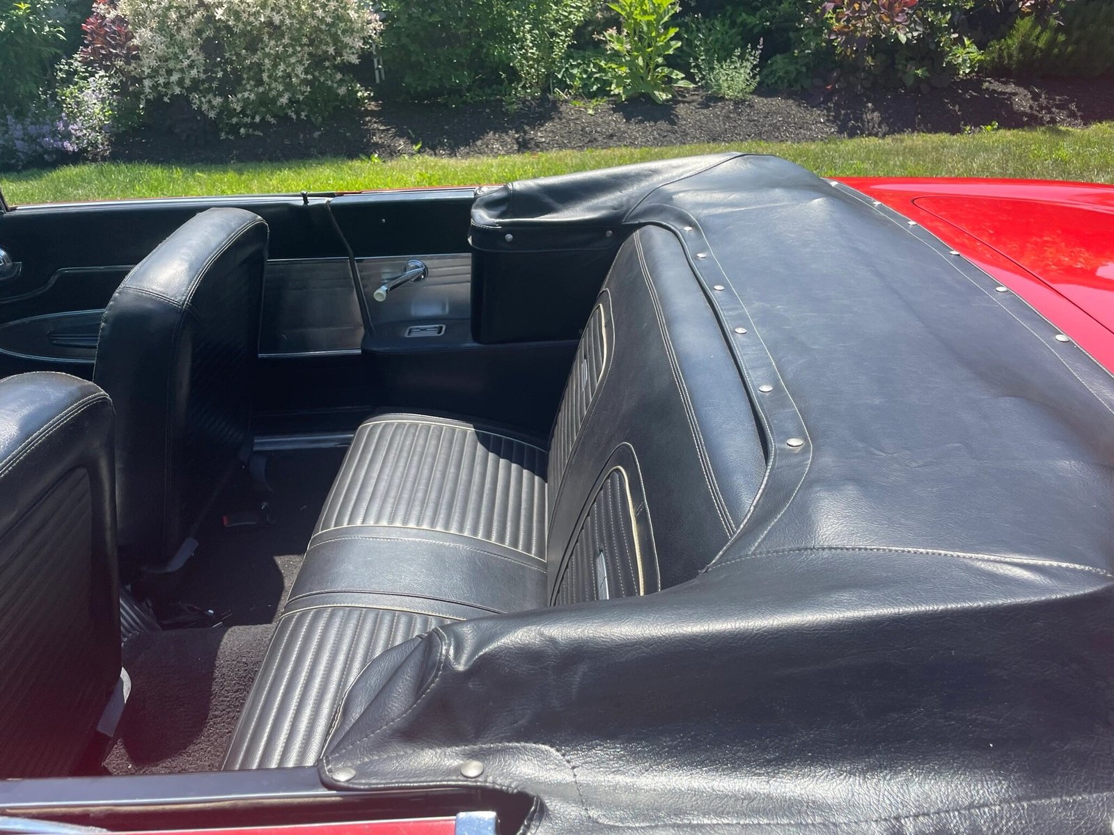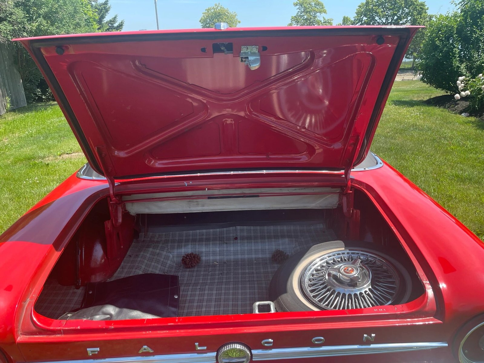 This 1963 Ford Falcon Sprint convertible is finished in red over black vinyl upholstery and is powered by a 260ci V8 paired with a five-speed manual transmission.