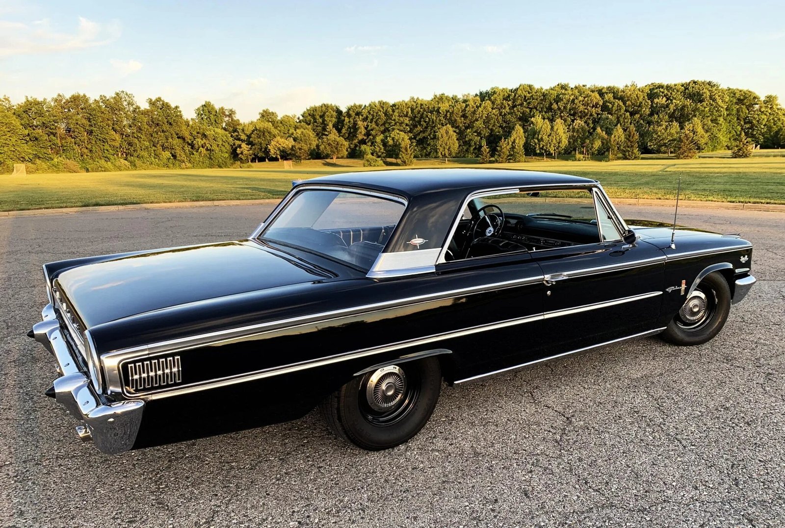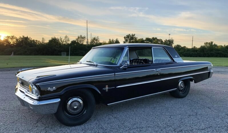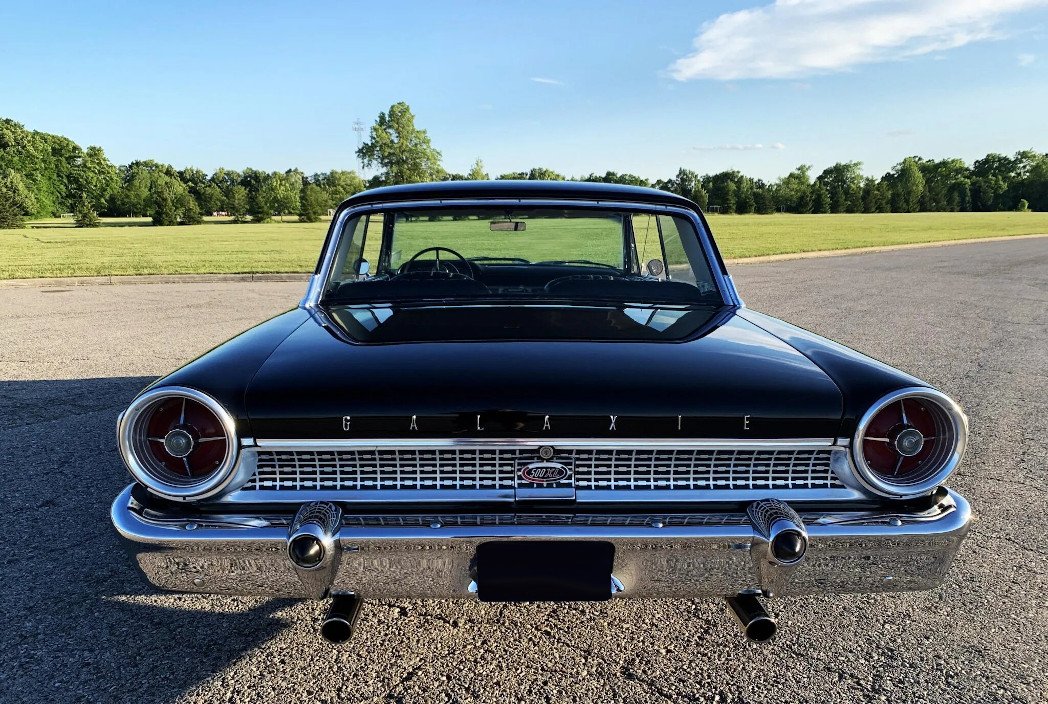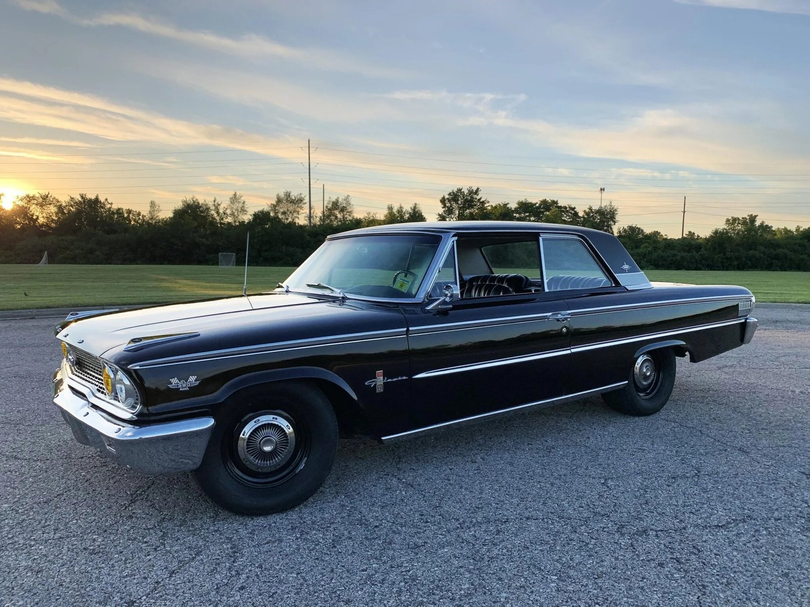 This 1963 Ford Galaxie 500XL two-door hardtop is finished in black over black vinyl and powered by a 390ci V8 with tri-power induction paired with a four-speed manual transmission.