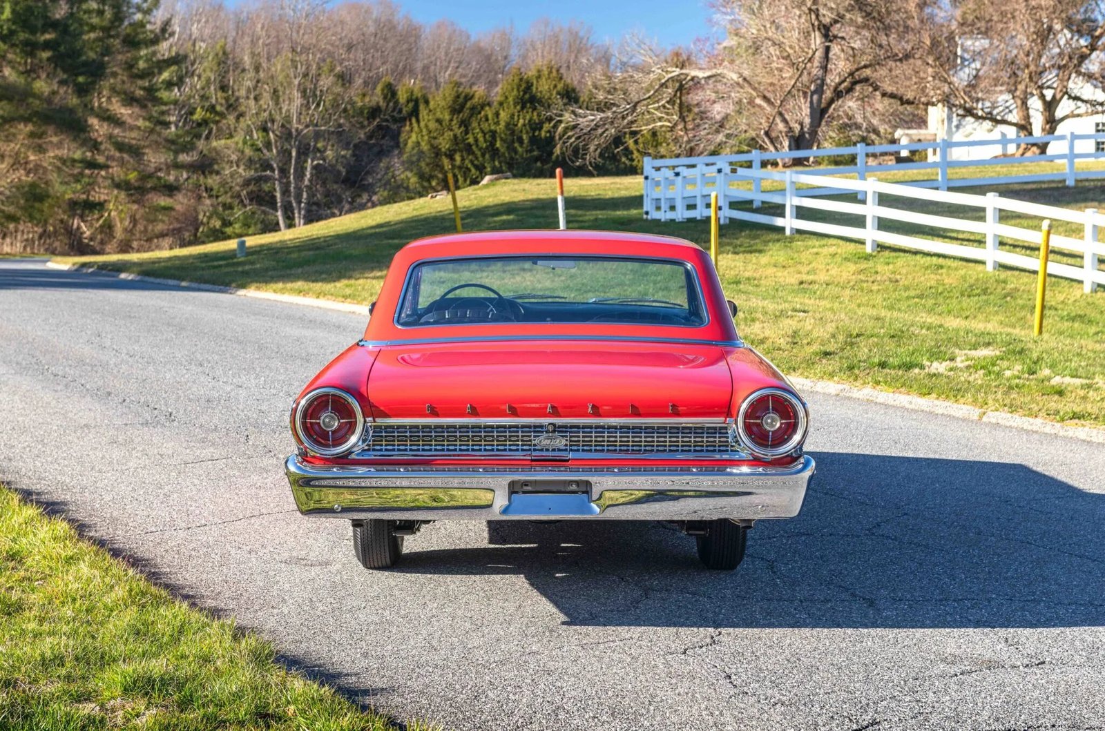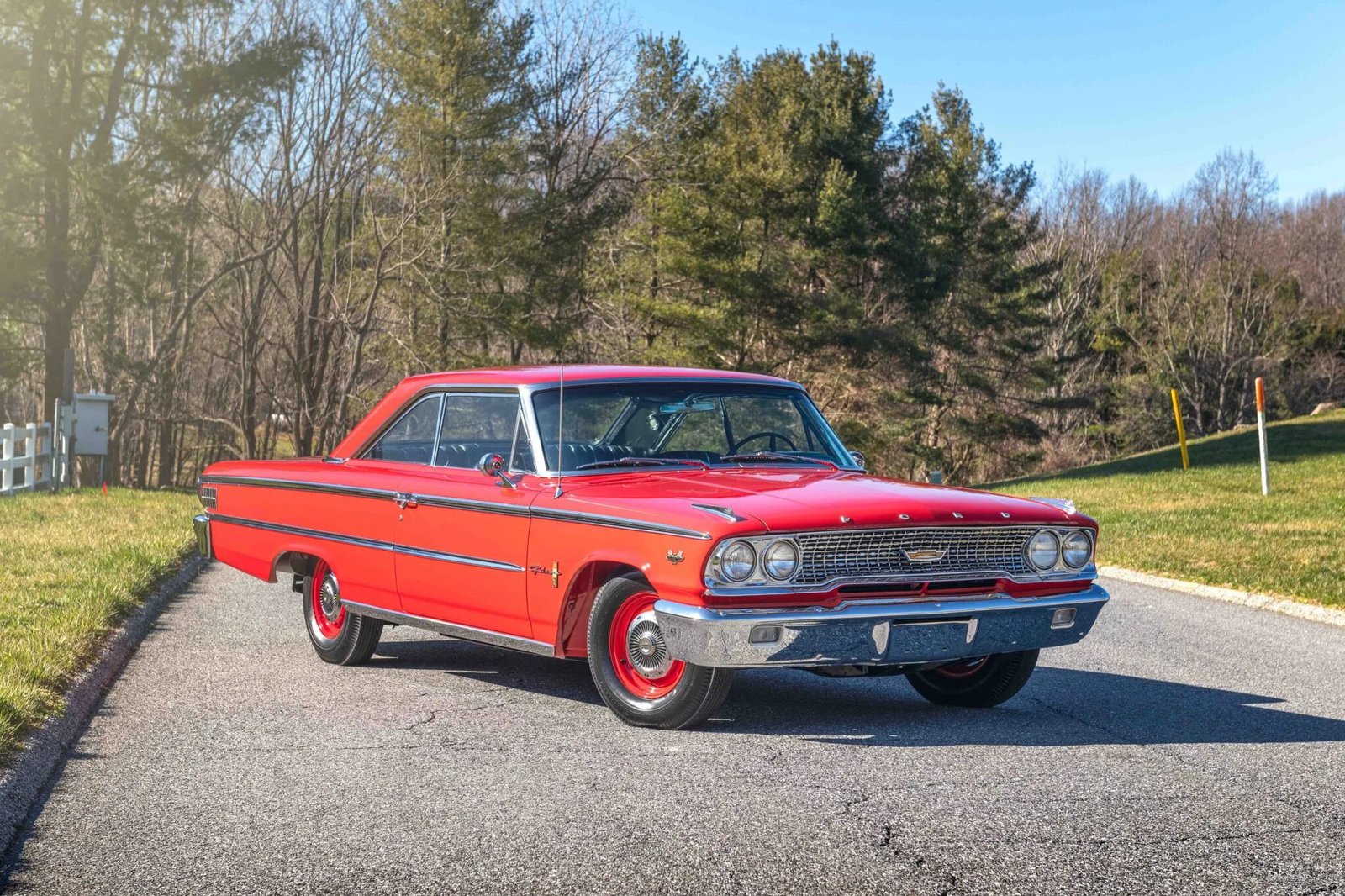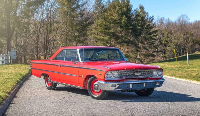 This 1963 Ford Galaxie 500XL is an R-code fastback coupe that is equipped with a 427ci V8 mated to a four-speed manual transmission and is finished in red over black vinyl upholstery. Equipment includes a center console, a push-button AM radio, body-color 15″ steel wheels, chrome bumpers, dual four-barrel carburetors, and a dual exhaust system.
