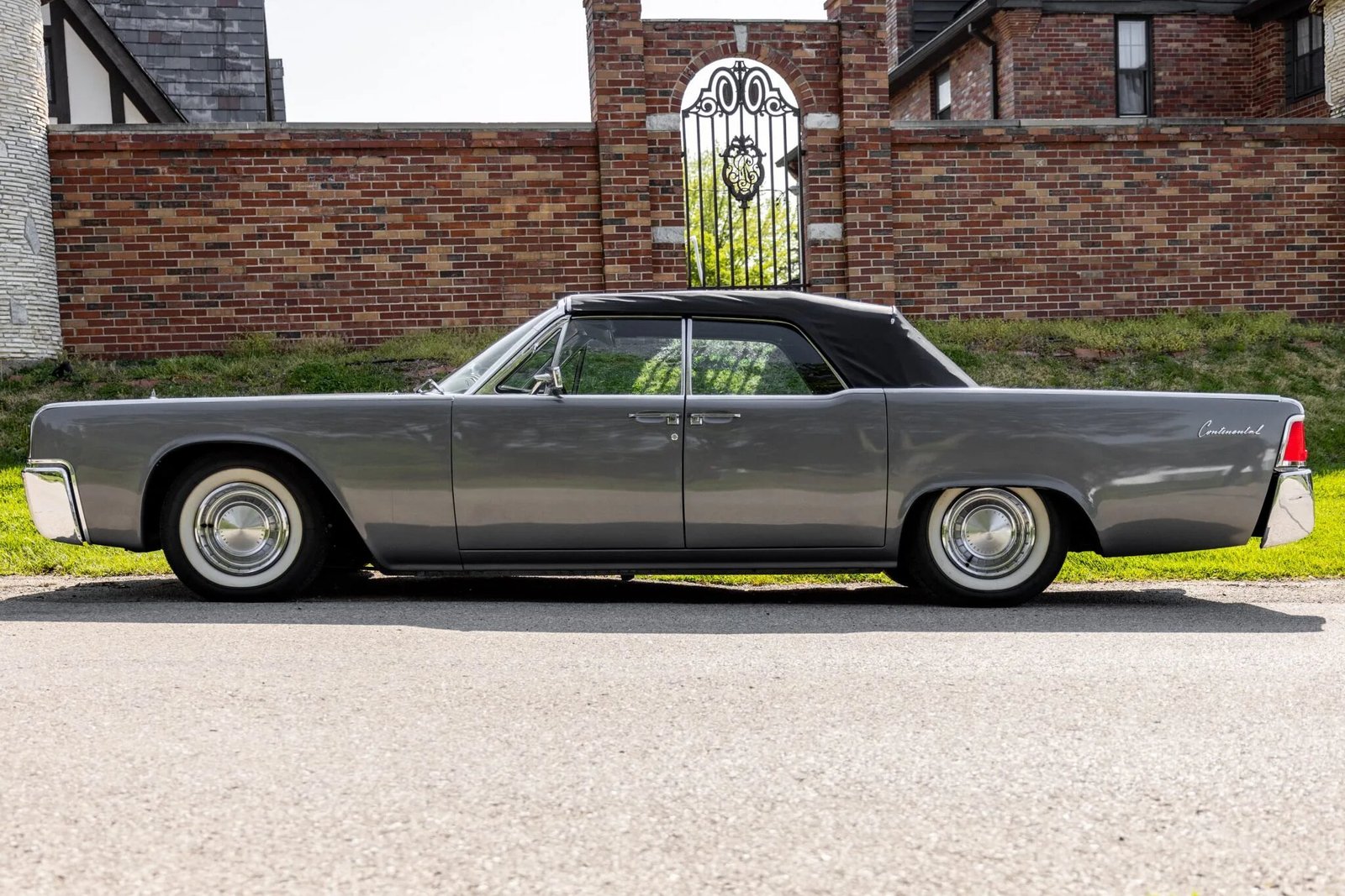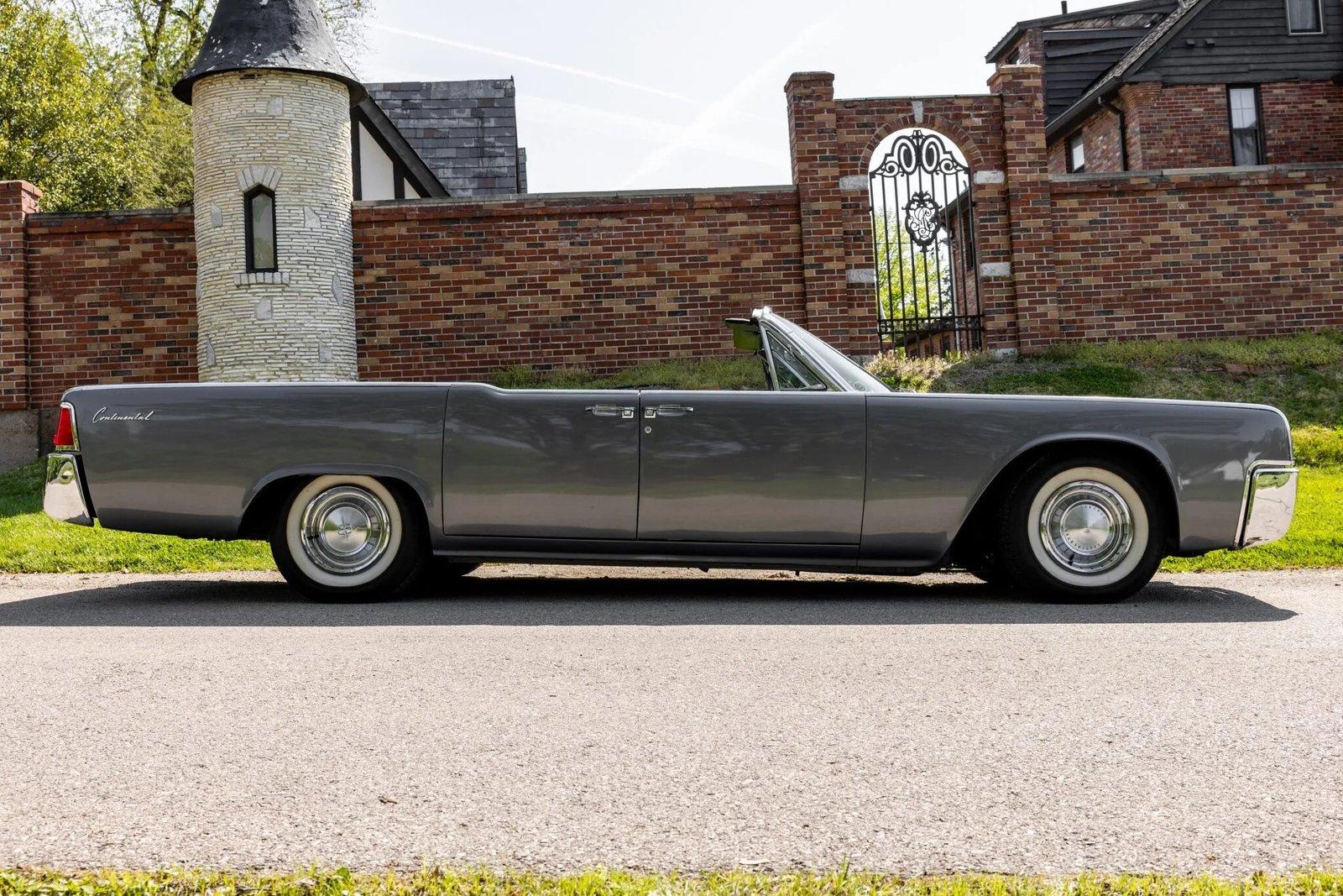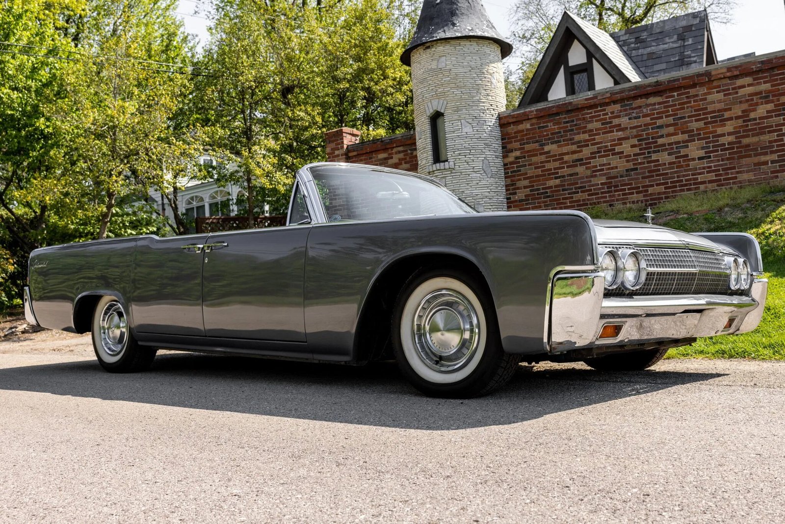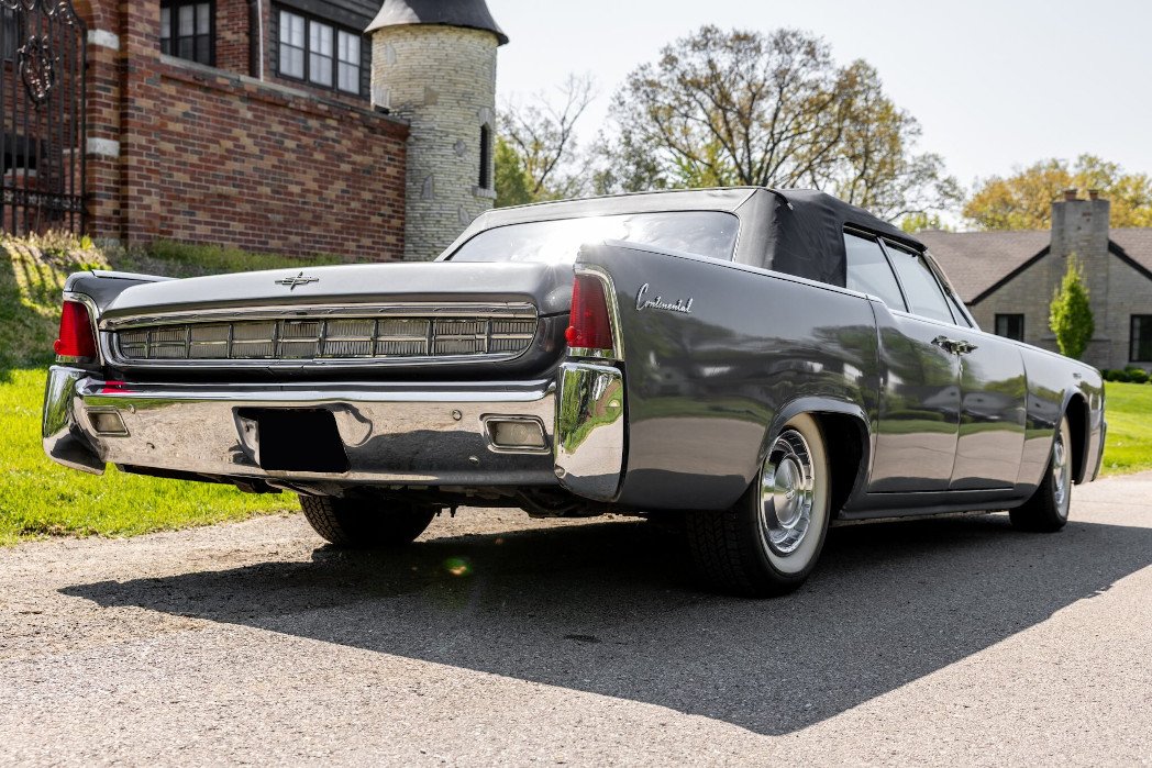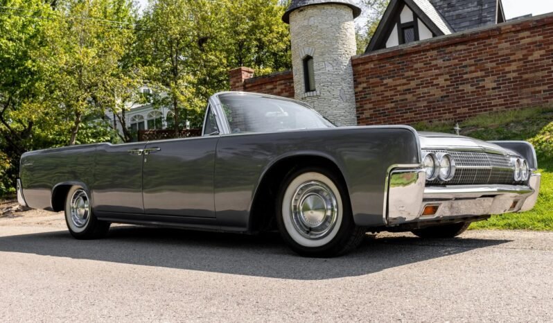 This 1963 Lincoln Continental convertible is finished in metallic gray over black leather upholstery and is powered by a 430ci V8 linked with a dual-range three-speed automatic transmission.
