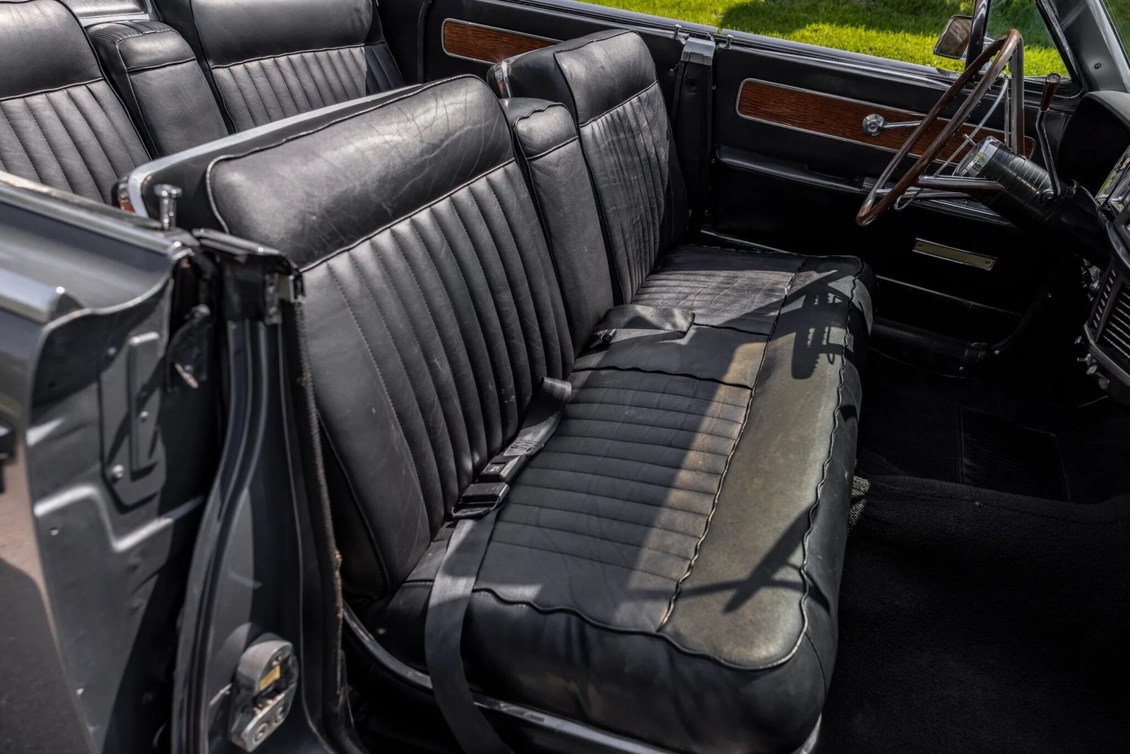 The front and rear bench seats are upholstered in black leather, while woodgrain trim accents the color-coordinated dashboard and door panels.