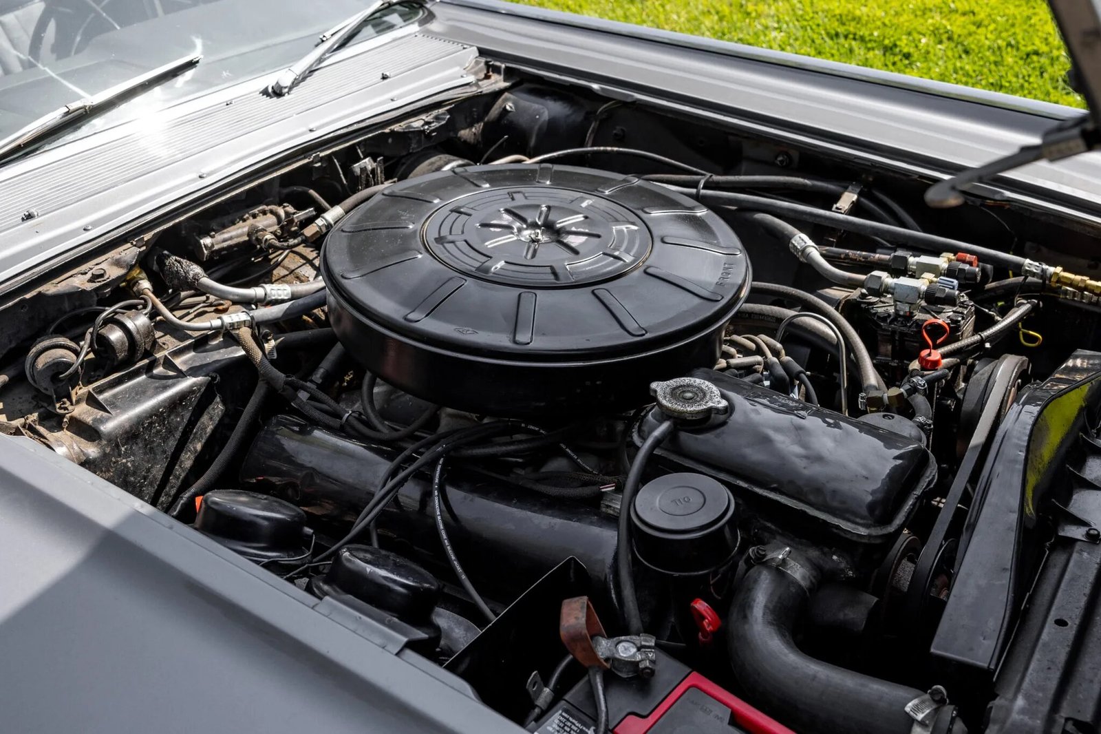 The front-hinged hood opens to reveal a 430ci V8 that was factory rated at 320 horsepower and 465 lb-ft of torque.