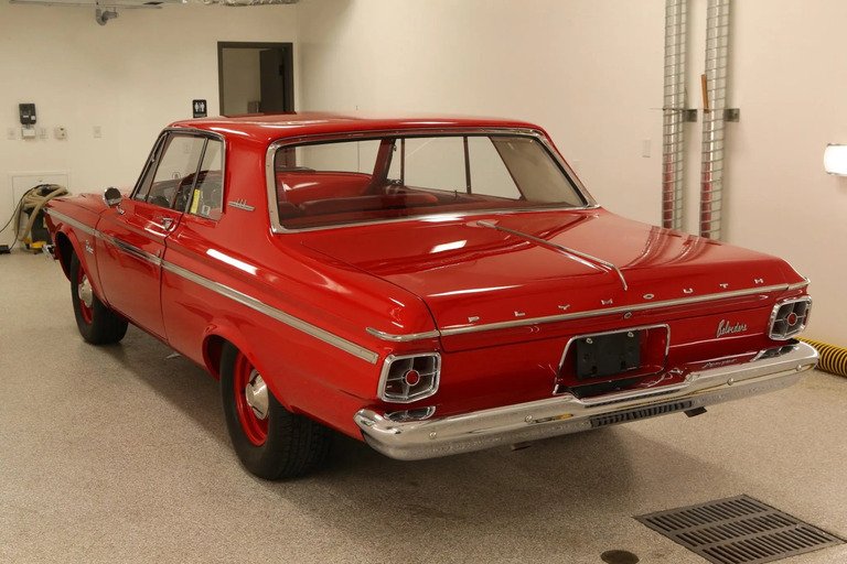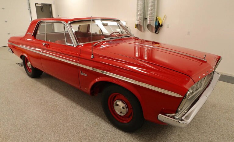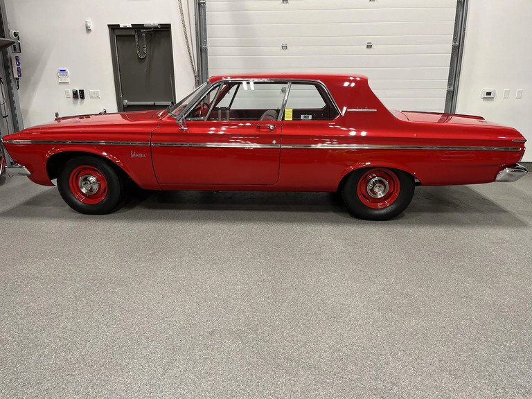 This 1963 Plymouth Belvedere is one of approximately 60 two-door hardtops examples produced for the model year with the 415 horsepower variant of the 426ci Max Wedge as well as a three-speed manual transmission. A four-speed manual transmission has since been installed. Refurbishment work completed by AutoKraft of Eau Claire, Wisconsin included repainting the body and retrimming the interior, and the engine was reportedly rebuilt by Wheeler Racing Engines of Blaine, Minnesota. Equipment includes a cross-ram intake manifold, dual four-barrel carburetors, a Sure-Grip differential, 15″ body-color steel wheels, four-wheel drum brakes, and a column-mounted Steward Warner tachometer.