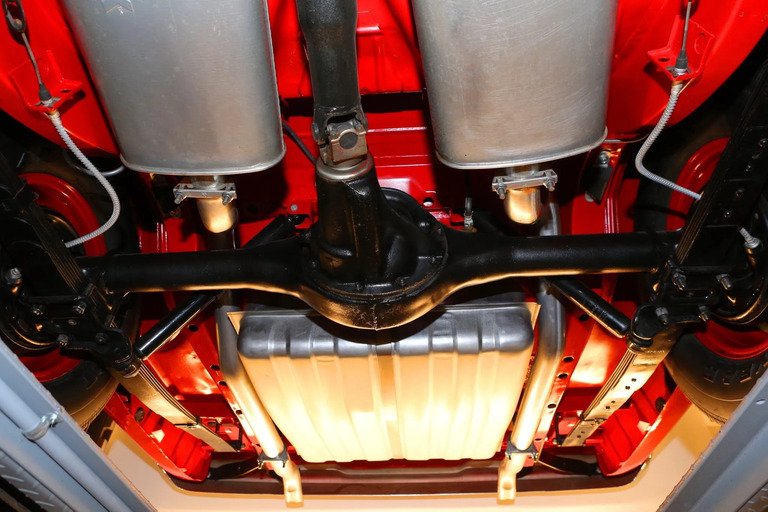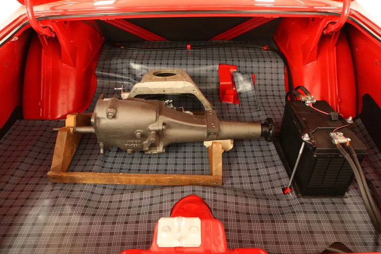 The interior was retrimmed as part of the refurbishment and features front and rear bench seats upholstered in red vinyl with cloth inserts. Additional equipment includes vent windows, a floor-mounted Hurst shifter, polished door sills, lap belts for the front occupants, a trunk-mounted battery, and a push-button AM radio.