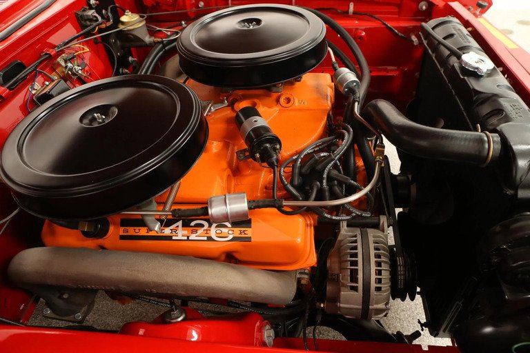 The 426ci Max Wedge V8 was rebuilt by Wheeler Racing Engines of Blaine, Minnesota, and is equipped with a cross-ram intake manifold topped with two four-barrel carburetors. The oil was changed in preparation for the sale. Power is sent to the rear wheels via a replacement four-speed manual transmission and a 3.16:1 Sure-Grip differential.