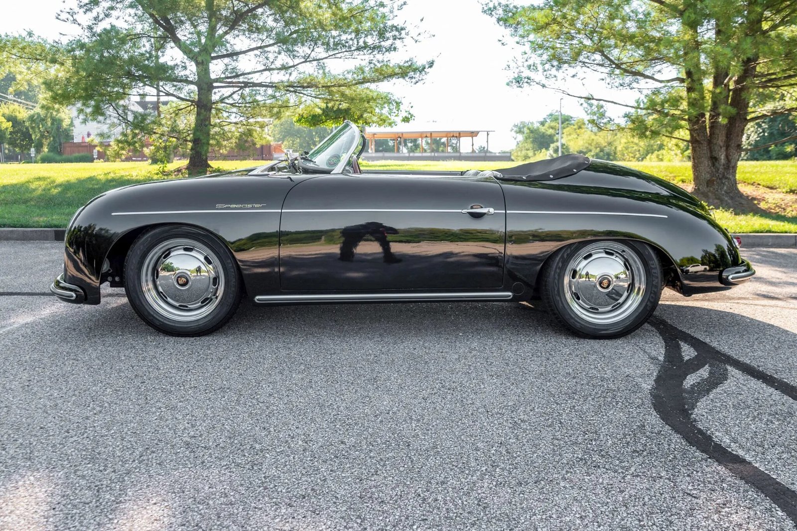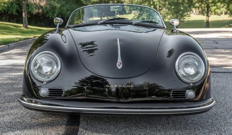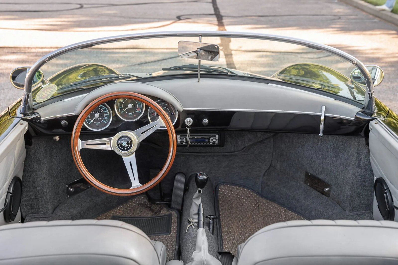 This Porsche 356 Speedster replica was built with a fiberglass body mounted over a modified Volkswagen Beetle chassis by Vintage Speedsters. Powered by a 1.6-liter flat-four mated to a four-speed manual transaxle, it is finished in black over gray upholstery, and it is equipped with dual Weber carburetors, 15″ steel wheels, front disc brakes, a black soft top, a Nardi steering wheel, sisal floor mats, and Kenwood speakers. Service in preparation for the sale included replacing the carburetors, pushrod tubes and seals, rear main seal, clutch assembly, fuel filter, spark plugs, ignition wires, and rear axle seals.