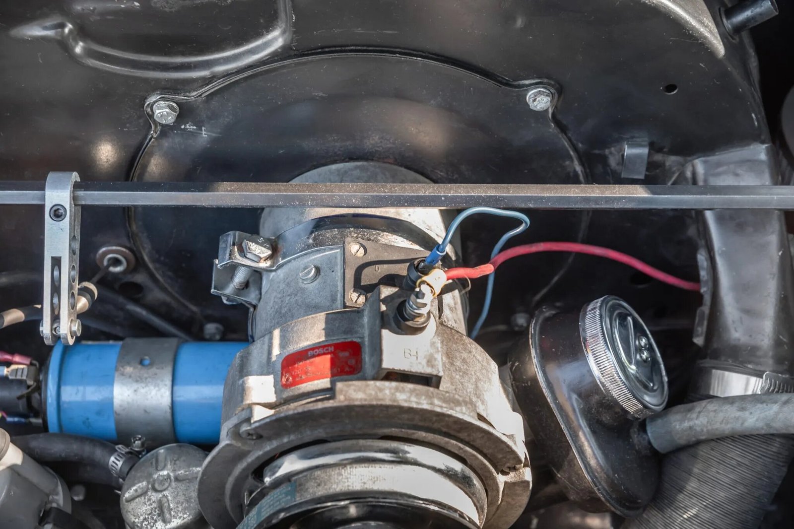 The air-cooled 1.6L flat-four breathes through dual Weber carburetors fitted in June 2023, at which time the ignition switch and battery cut-off switch were replaced. The pushrod tubes and seals were replaced along with the rear main seal, spark plugs, ignition wires, fuel filter, and engine oil in preparation for sale. The alternator was replaced in preparation for the sale. Power is sent to the rear wheels via a four-speed manual transaxle. The clutch assembly and rear axle seals were replaced.