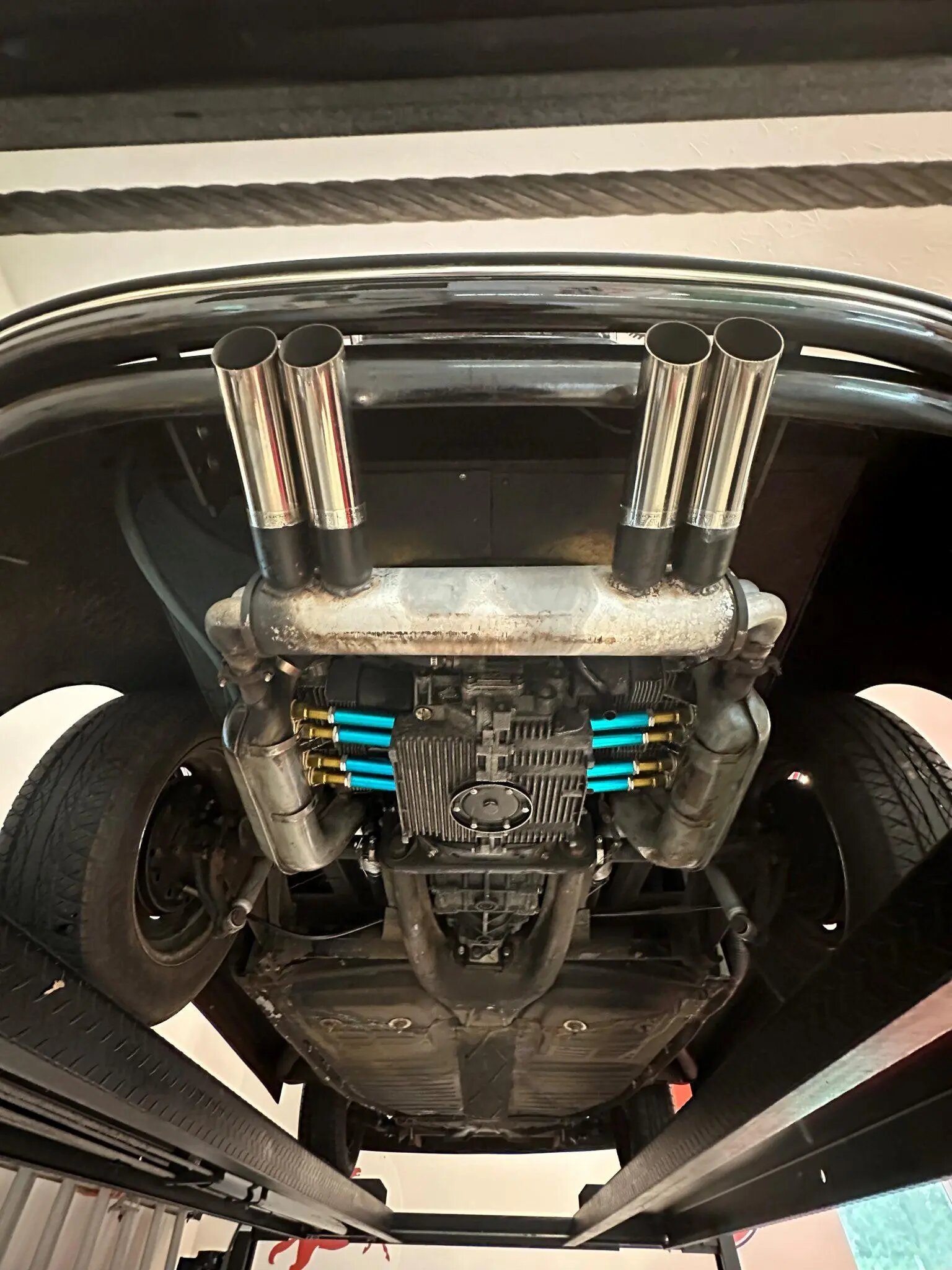 The fiberglass body is mounted over a shortened Volkswagen Beetle chassis and is finished in black. Exterior details include halogen headlights, a black top and top boot, gold-finished badging, quadruple polished exhaust outlets, and body-color bumpers with bright trim and inset rub strips.