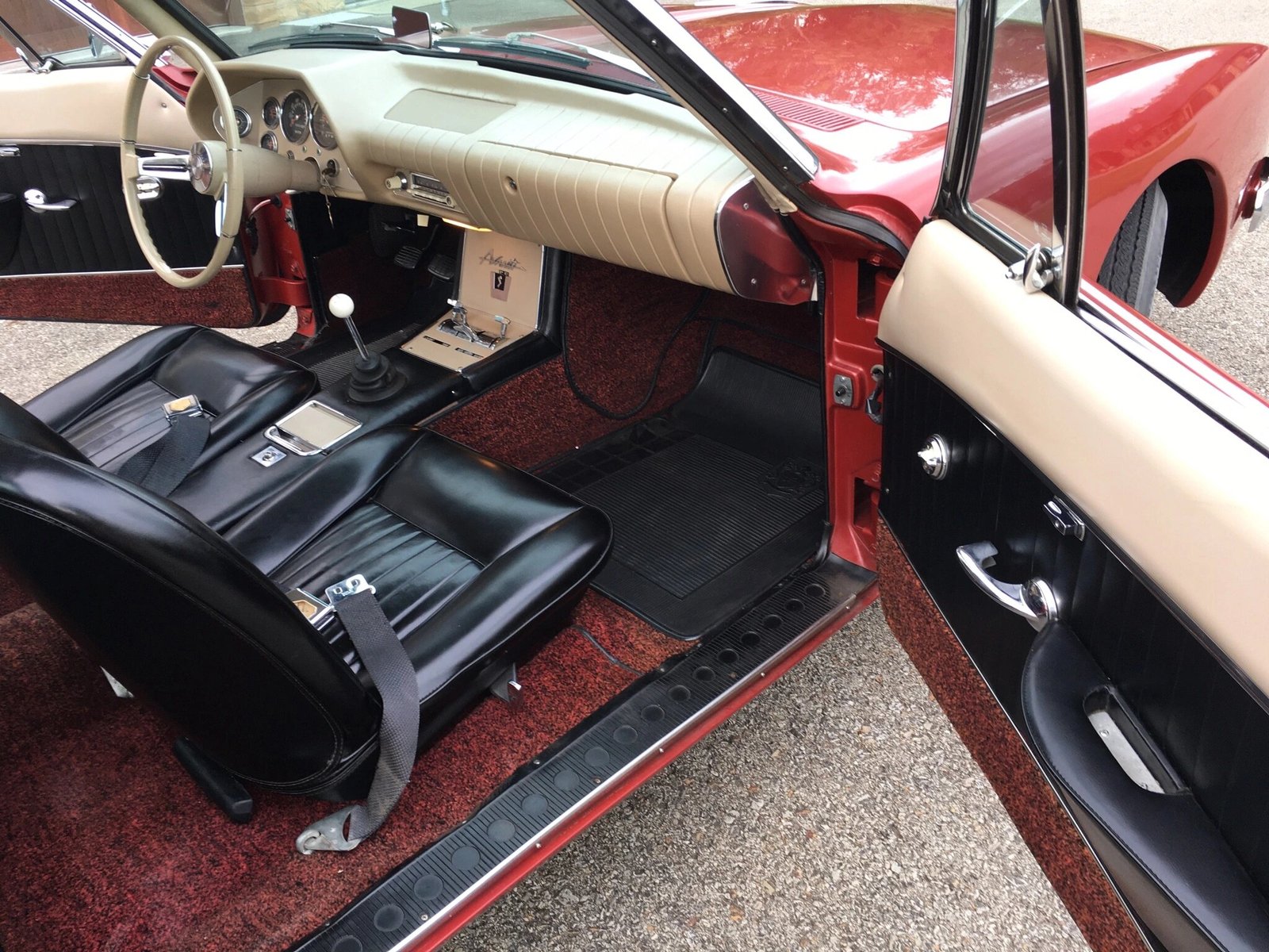 Bucket seats are finished in black Regal vinyl upholstery and accented by red carpets and a fawn padded dash.