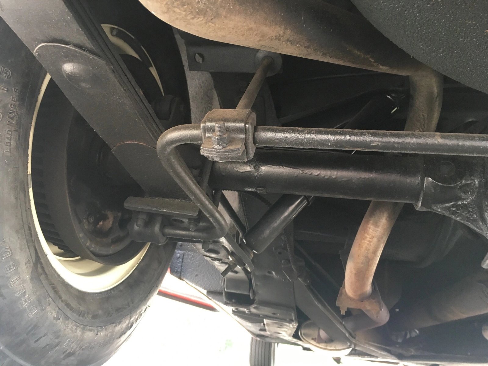Stamped steel 15″ wheels wear decorative 5-spoke covers and are fitted with older Firestone whitewall radials.