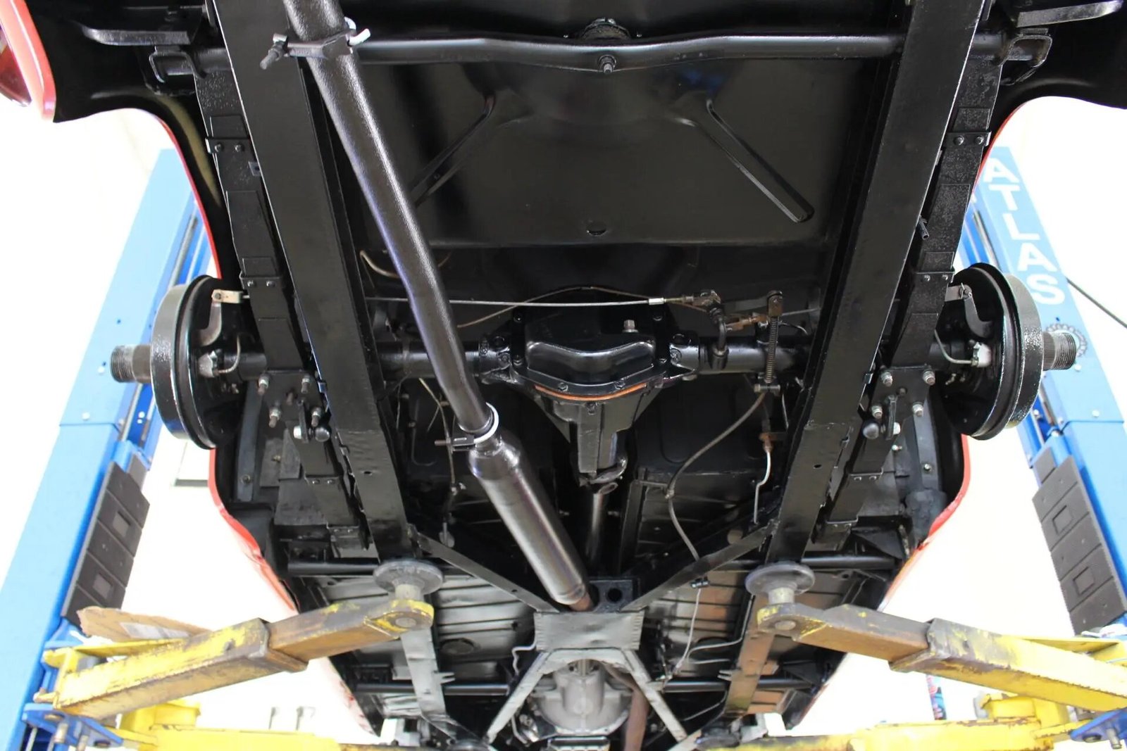 Chrome-finished 15″ wire wheels are secured via two-eared knock-off spinners and are mounted with Bridgestone RD-108 tires.