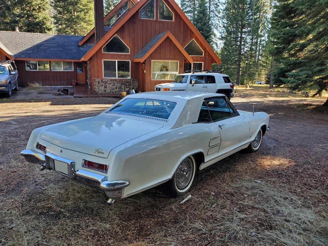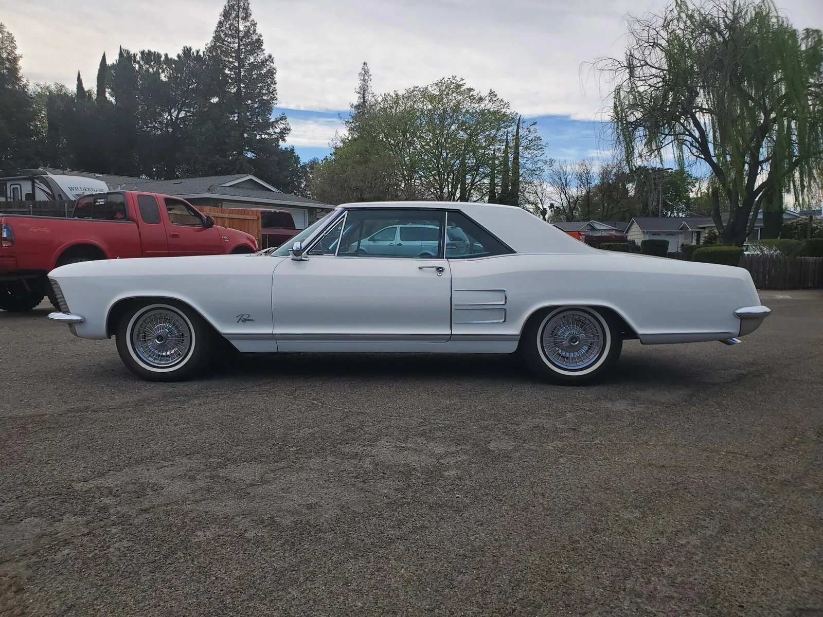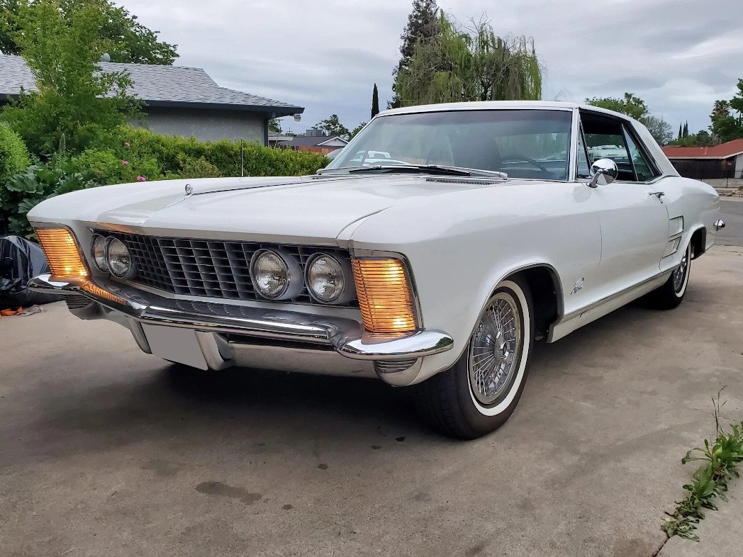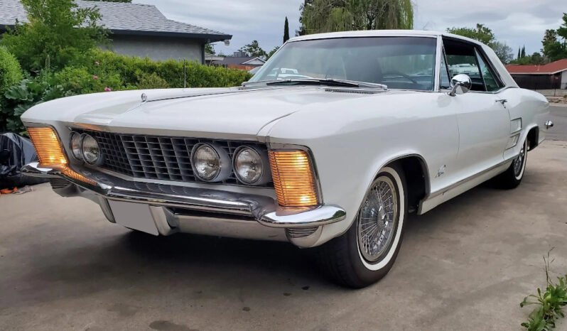 This 1964 Buick Riviera is finished in white over black vinyl and powered by a numbers-matching 425ci Super Wildcat V8 paired with a three-speed automatic transmission.