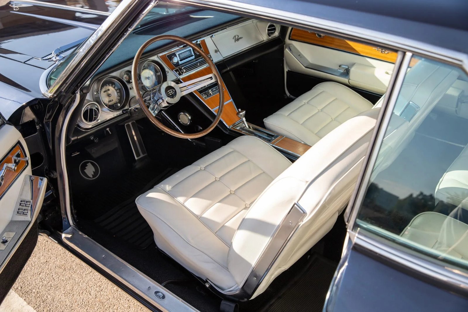 The cabin features two rows of bucket seats upholstered in white vinyl along with matching door panels and black carpets. Wood veneer accents the center console and door panels, while the power window and remote mirror controls are housed within the outer armrests. Features include air conditioning, power windows, polished door sills, and a RetroTone radio with a subwoofer mounted beneath the driver’s seat.