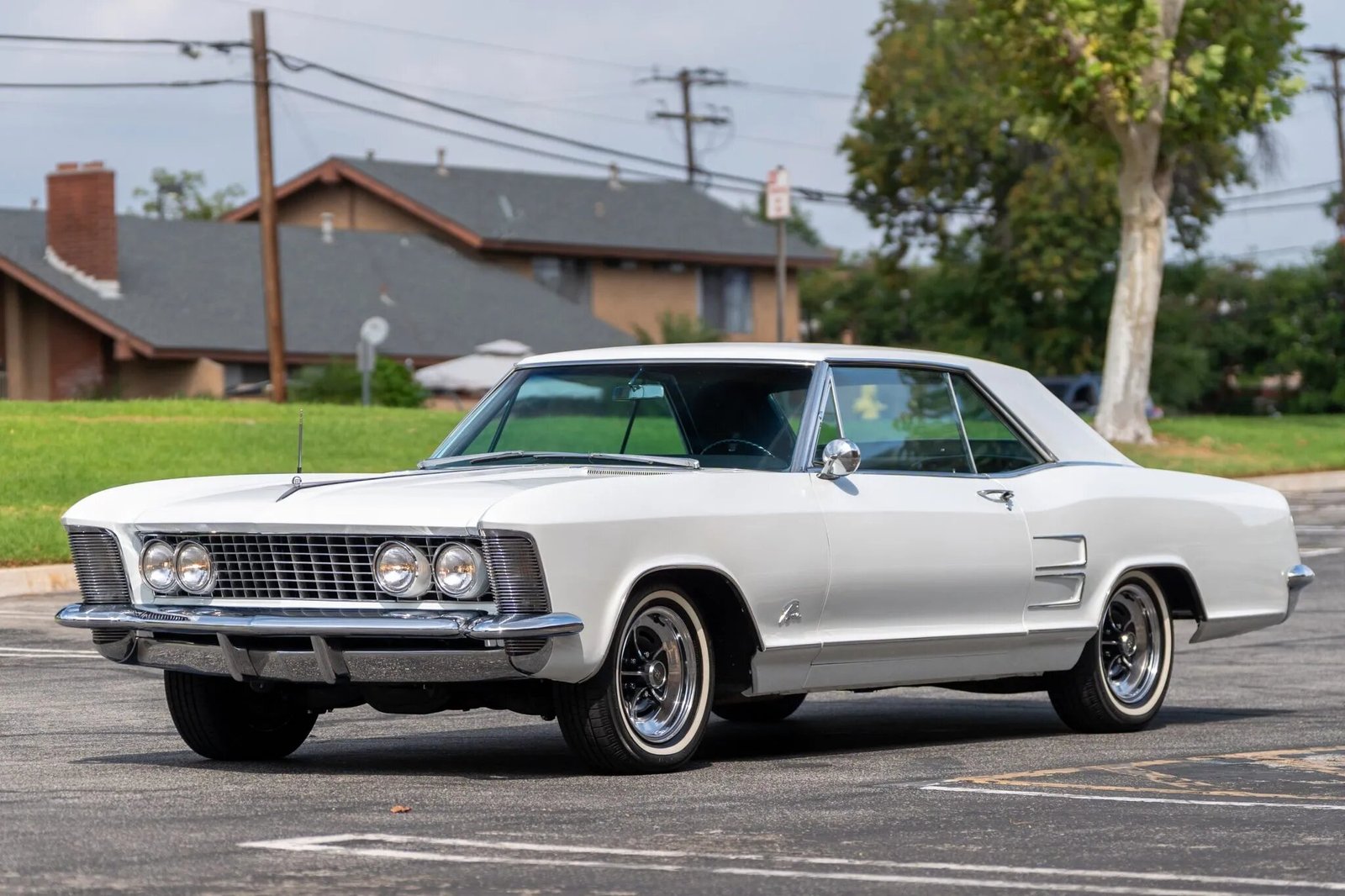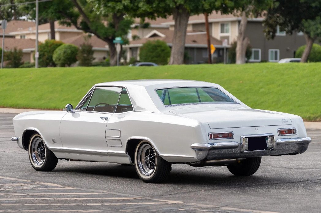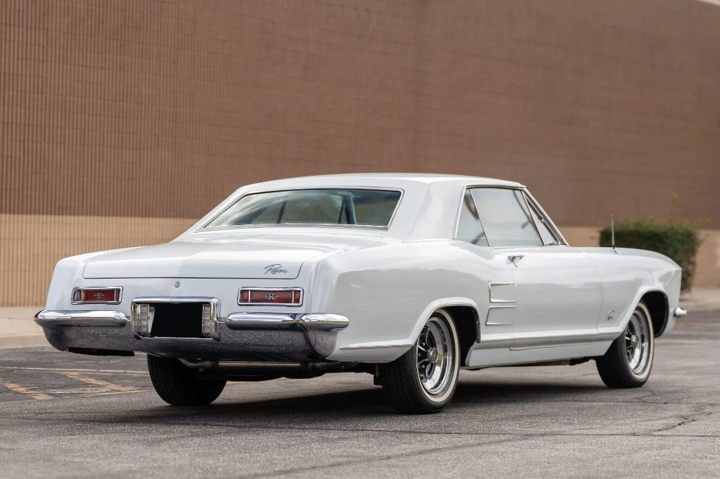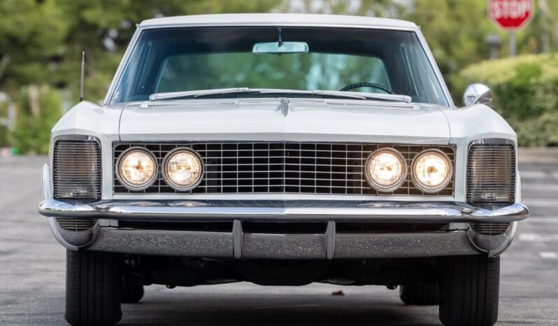 This 1964 Buick Riviera is finished in white over black and powered by a 425ci Super Wildcat V8 paired with a three-speed automatic transmission. Equipment includes dual carburetors, power windows, an AM/FM radio, and chrome 15″ wheels.