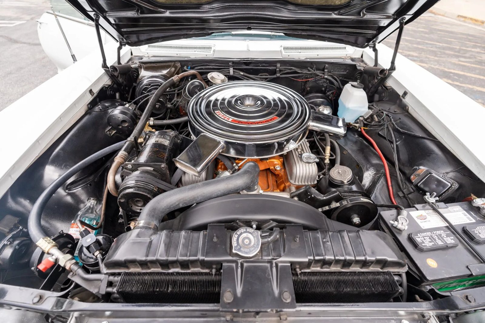 Originally delivered in Coral Mist, the car was refinished in white. Features include an egg-crate grille, quad headlights, chrome bumpers and trim, and faux quarter-panel intakes.