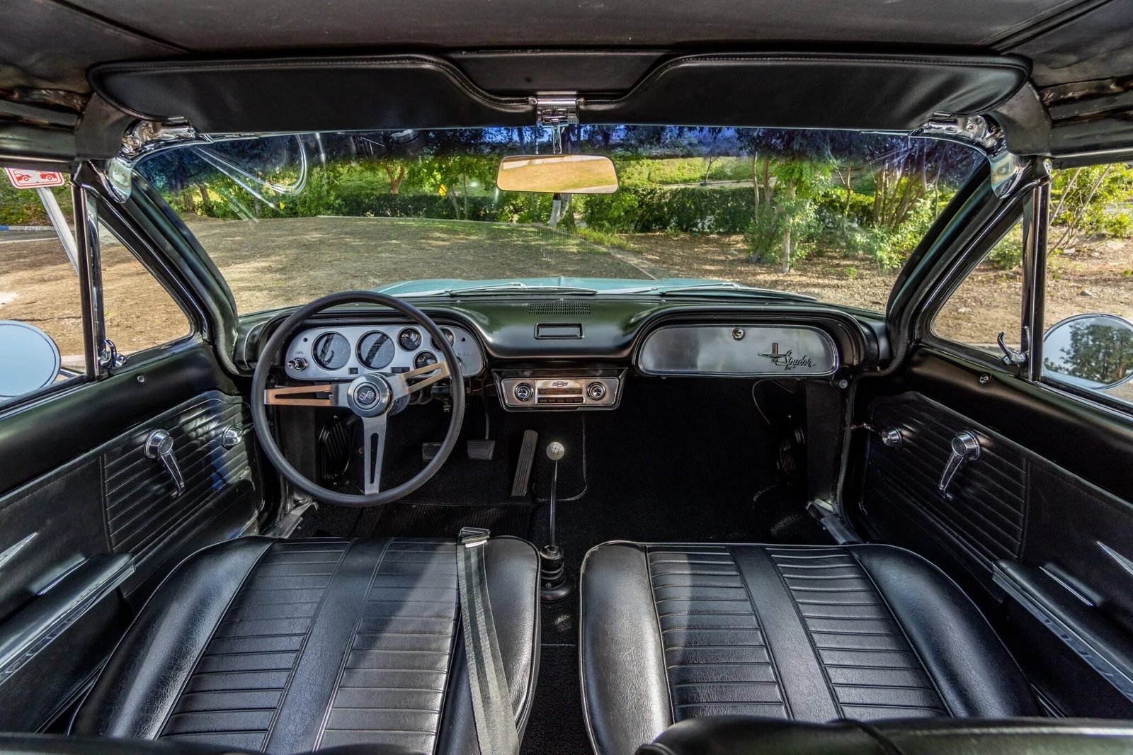 The refurbished interior features front bucket and rear bench seating upholstered in black vinyl with matching door panels and carpeting.