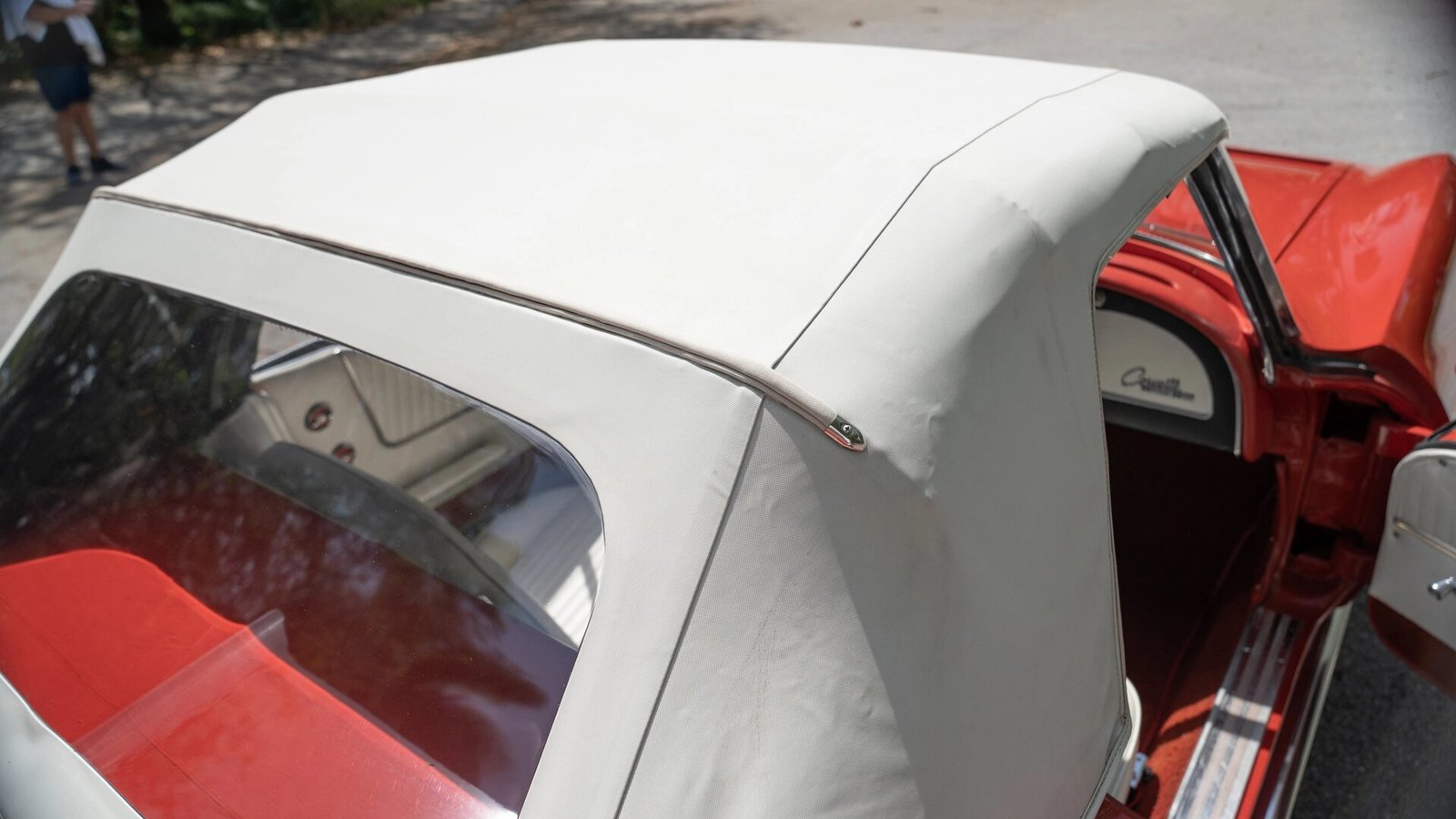 The fiberglass body have been finished in its factory shade of Riverside Red (923) and features a replacement white convertible soft top as well as front fender vents, quad tail lamps, chrome bumperettes, and flip-up headlamps with aftermarket electronic operation.