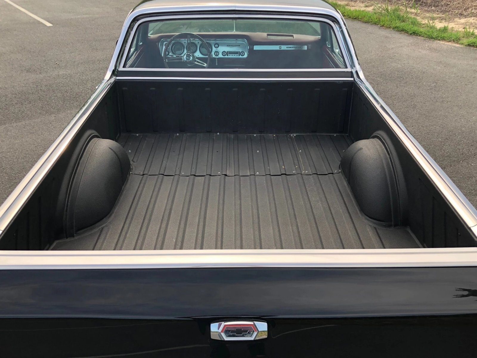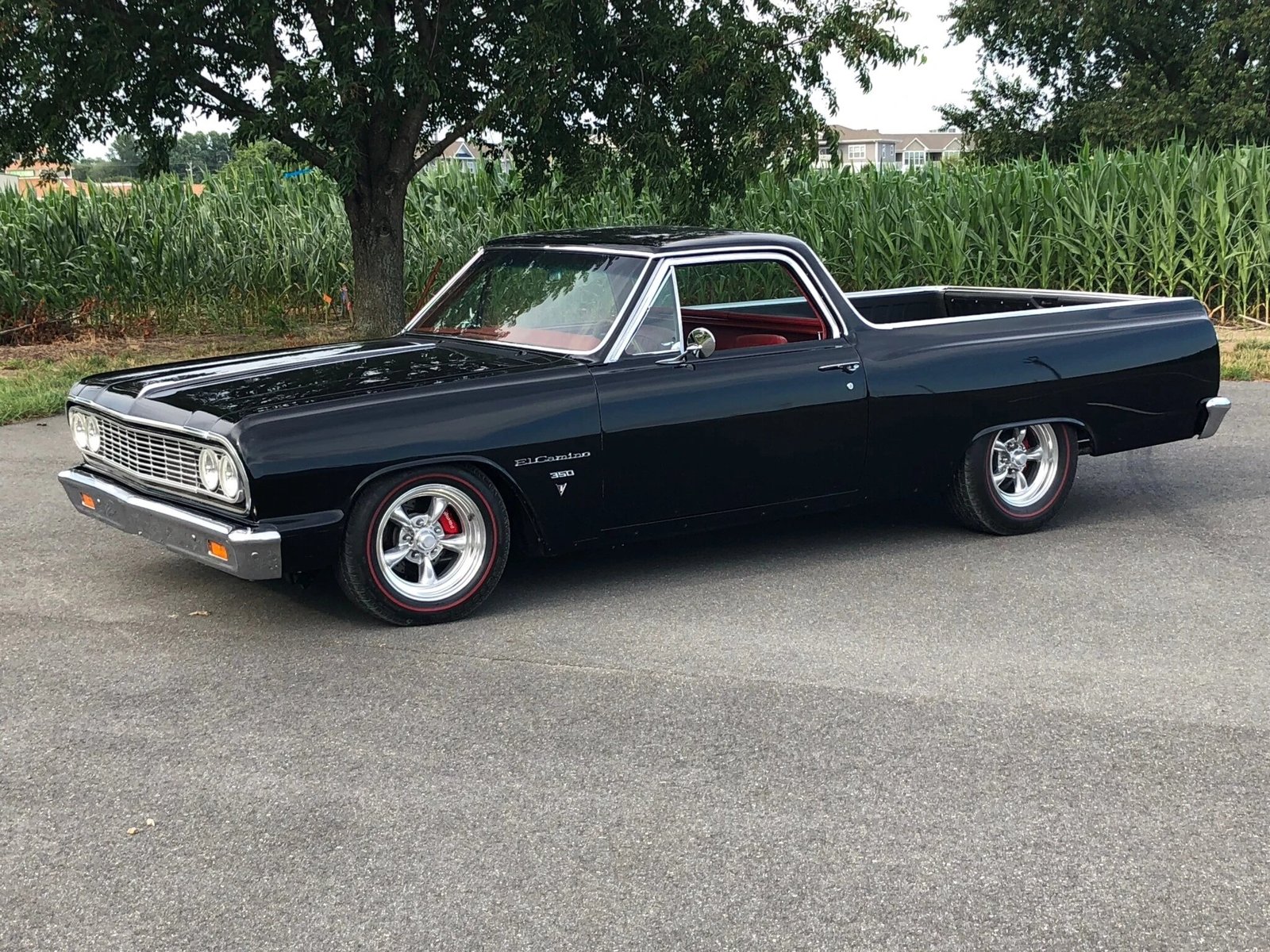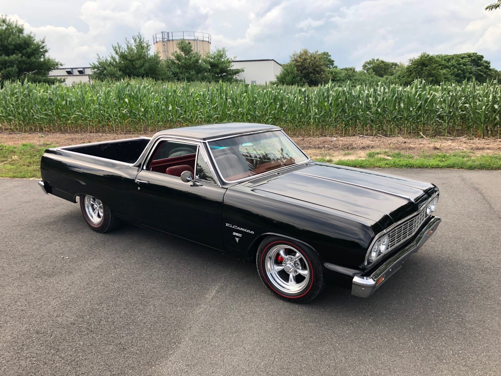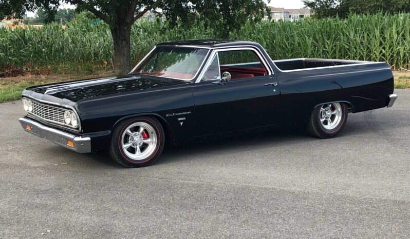 This 1964 Chevrolet El Camino was refurbished, and it is finished in black over a custom red leather interior. Power is provided by a 355ci V8 mated to a Tremec five-speed manual transmission, and recent service have included a carburetor tune and an oil change. Modifications include a Detroit Speed front and rear suspension, Wilwood four-wheel disc brakes, and American Torq Thrust II wheels.