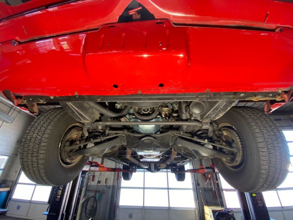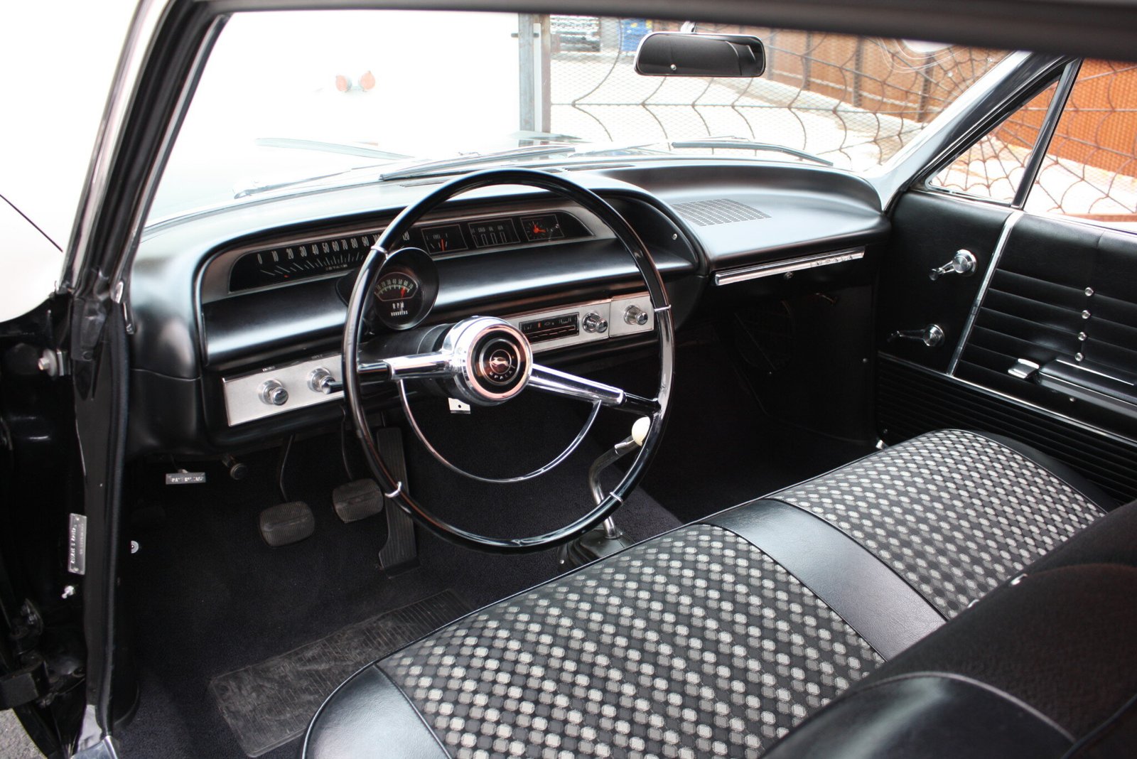 Additional equipment includes a floor shifter with a reverse lockout handle and cueball knob, a heater with a defroster, and a factory-style AM radio.
