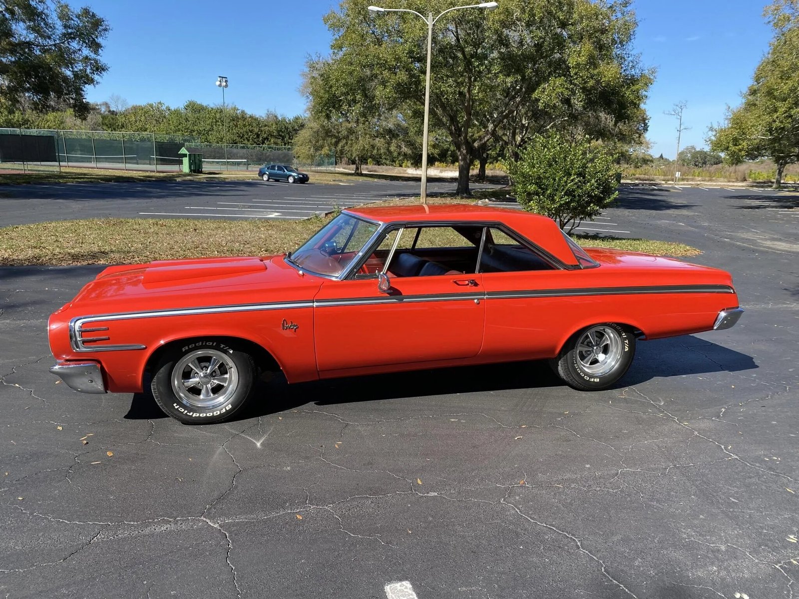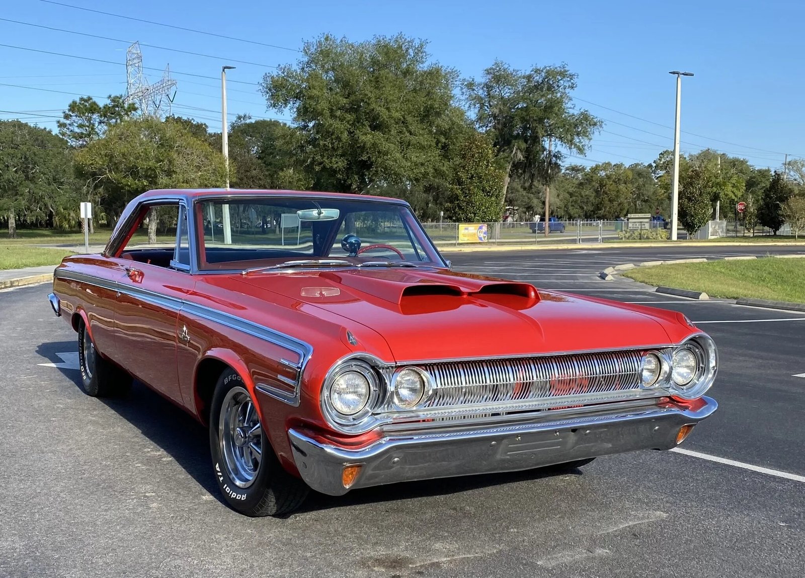 This 1964 Dodge 440 is a two-door hardtop that is finished in red over a red interior and is powered by a replacement 426ci Wedge V8 paired with a four-speed manual transmission and a 3.55:1 limited-slip differential.