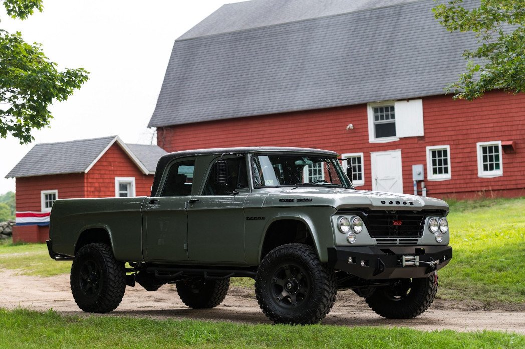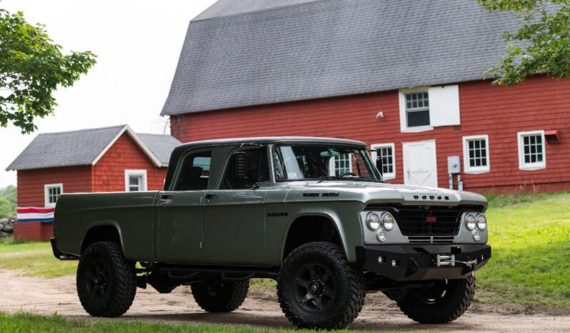 This 1964 Dodge Power Wagon crew cab was originally built in September 1963, and in 2016 the body was refinished in gray with black accents and placed on a shortened chassis from a 2006 Dodge Ram 2500 Mega Cab 4×4 pickup truck.Power comes from a Magnuson-supercharged 5.7-liter Hemi V8 paired with a five-speed automatic transmission and dual-range transfer case from the Ram 2500, and the chassis received a Kore Performance 3″ lift. Other modifications include Fox Shocks, four-wheel disc brakes, limited-slip front and rear differentials, 18″ Fuel wheels, 37″ Nitto mud-terrain tires, and an alligator-print vinyl roof cover along with aftermarket bumpers and lighting. The four-door cabin is upholstered in black and tan leather, and air conditioning, power windows, and a Bluetooth sound system with a subwoofer have been added.