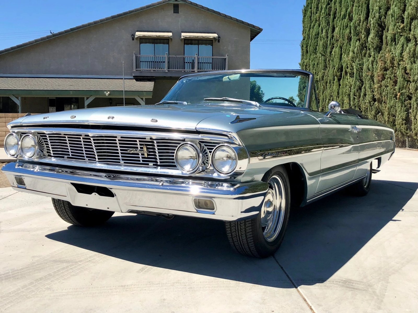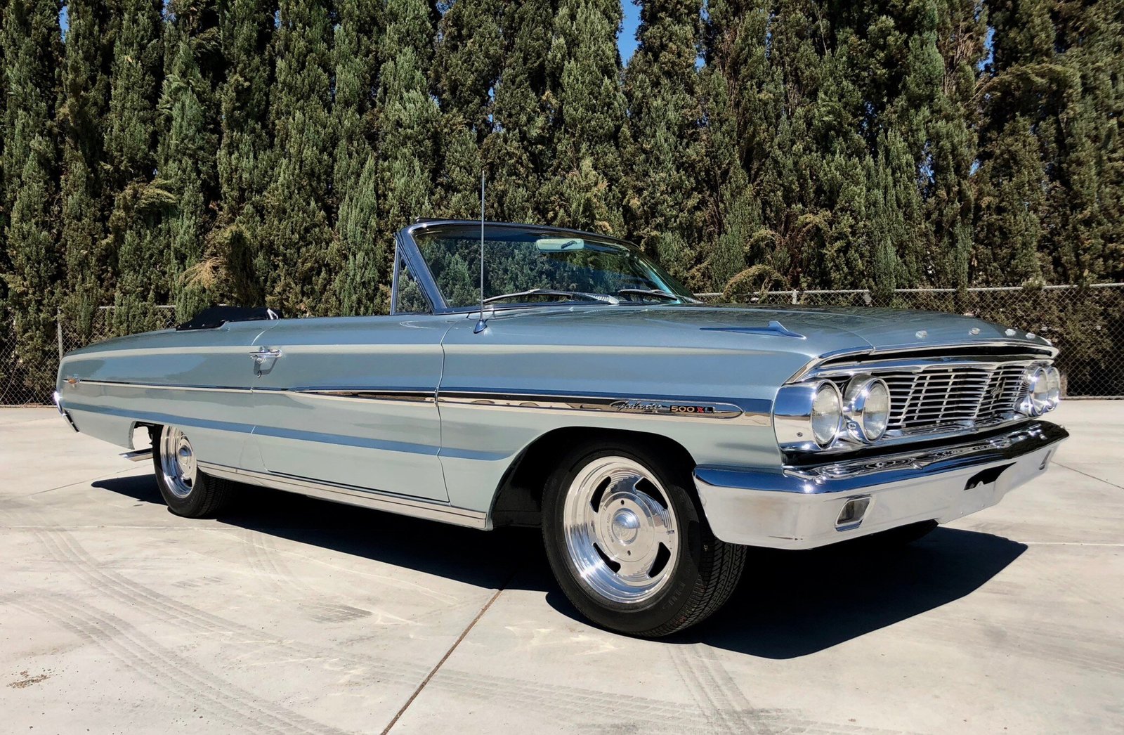 This 1964 Ford Galaxie 500XL convertible was manufactured in Los Angeles, California and a refurbishment completed in 2018 featured exterior and interior color changes along with new wheels and brake and suspension refreshes.