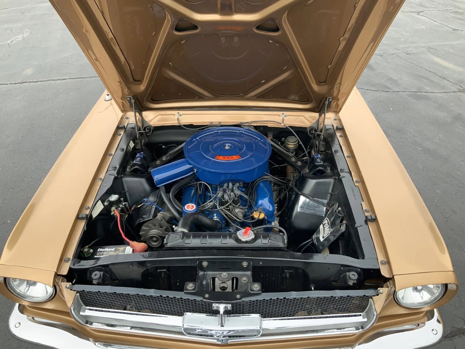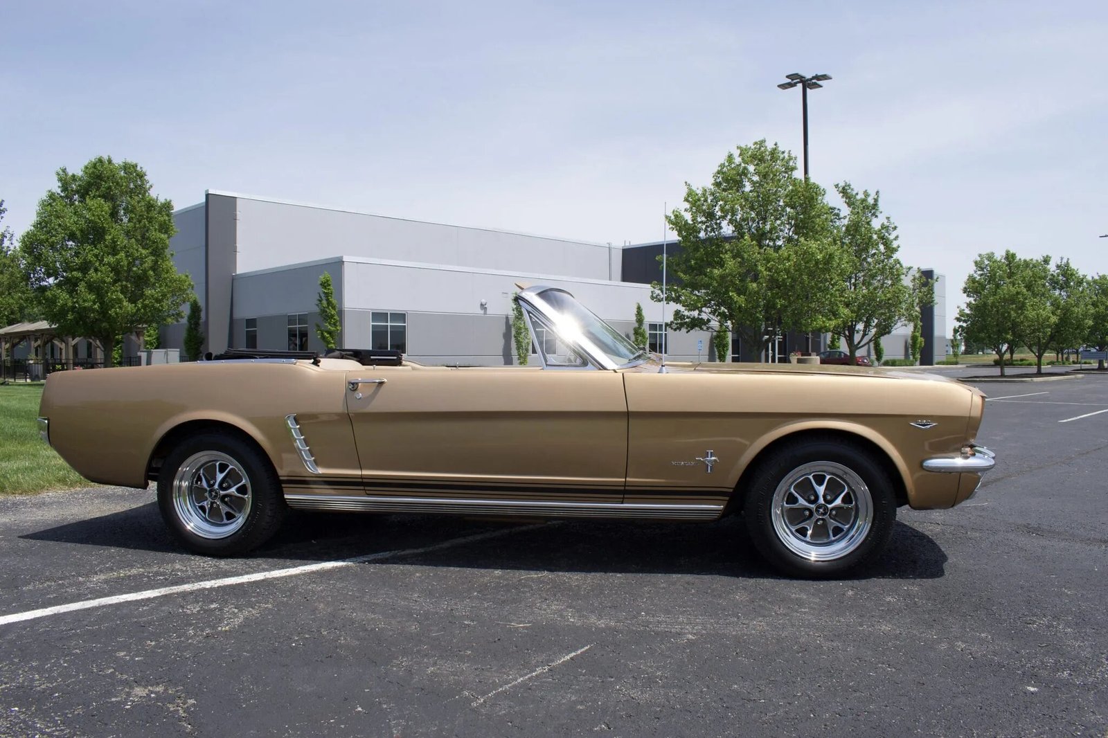 This 1964 1/2 Ford Mustang convertible is finished in bronze over tan vinyl upholstery and powered by a 260ci V8 paired with a four-speed manual transmission.
