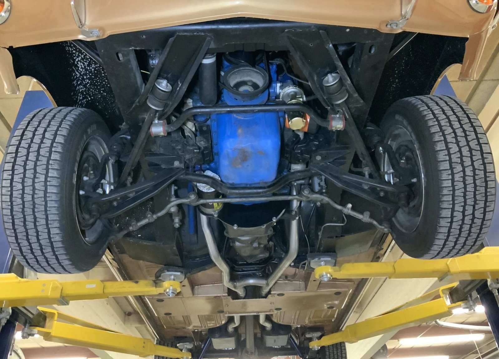 The front bucket seats and rear bench are upholstered in tan vinyl and are complemented by a color-coordinated dashboard, door panels, and carpets.