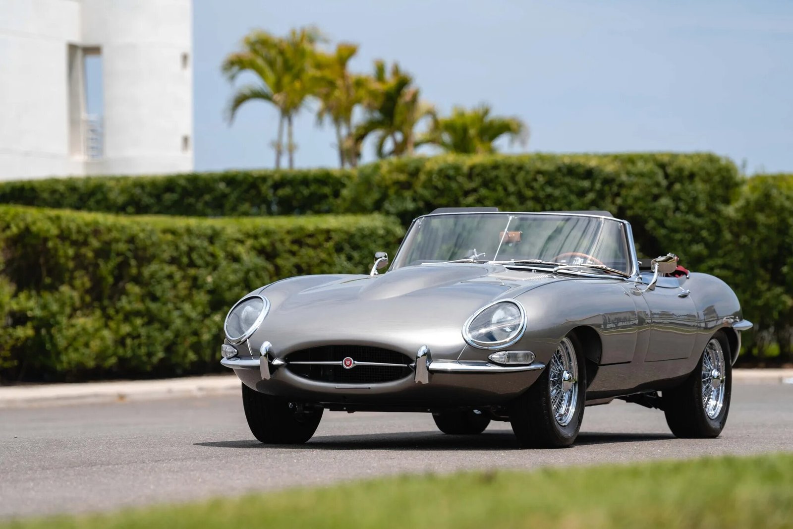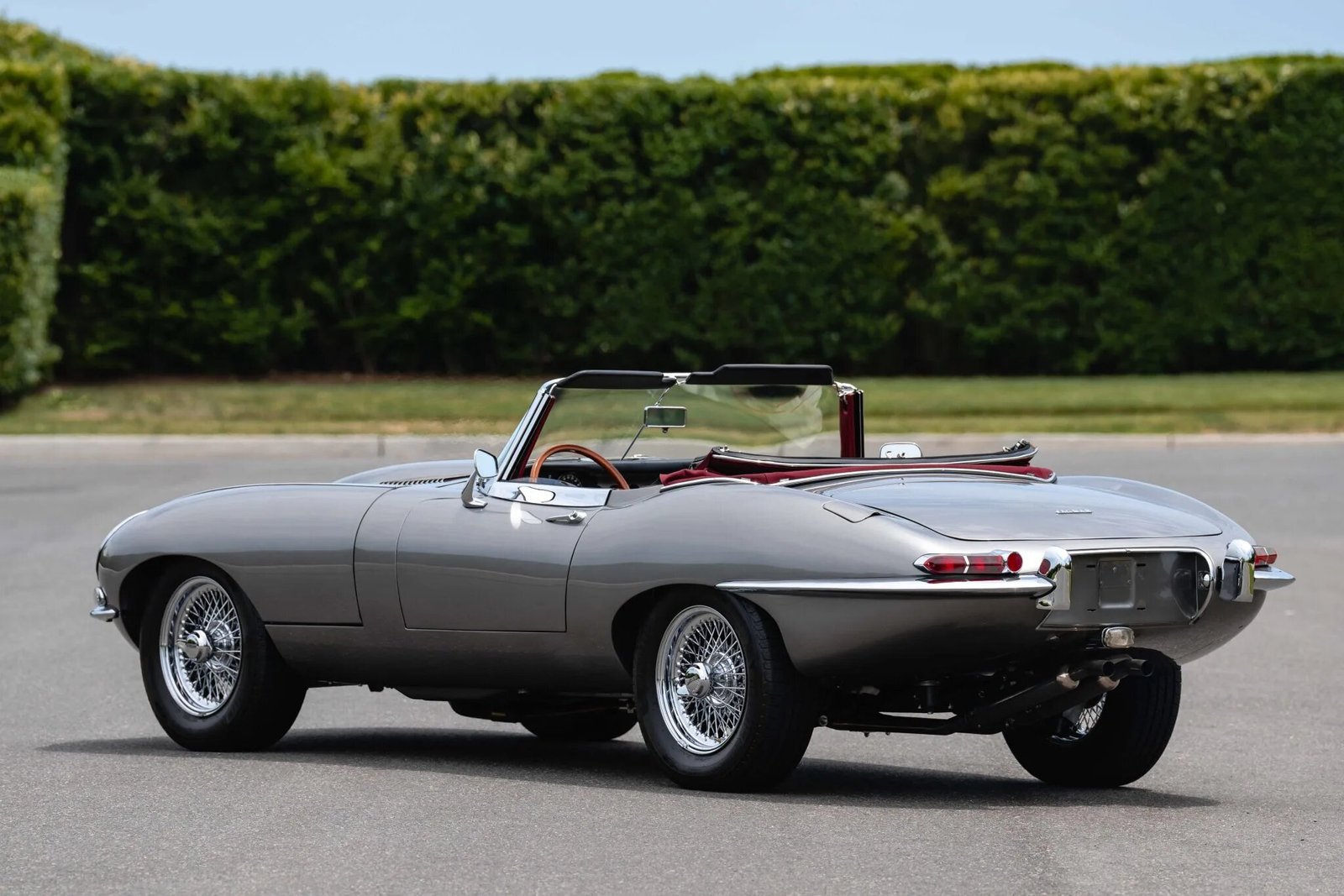 This 1964 Jaguar XKE Series I roadster was refurbished and is finished in Opalescent Gunmetal over burgundy leather. Power is provided by a 3.8-liter inline-six paired with a five-speed manual transmission, and equipment includes a retractable soft top, 15″ wire wheels, triple SU carburetors, chrome-finished bumpers, electric power steering, aftermarket air conditioning, and a wood-rimmed steering wheel.