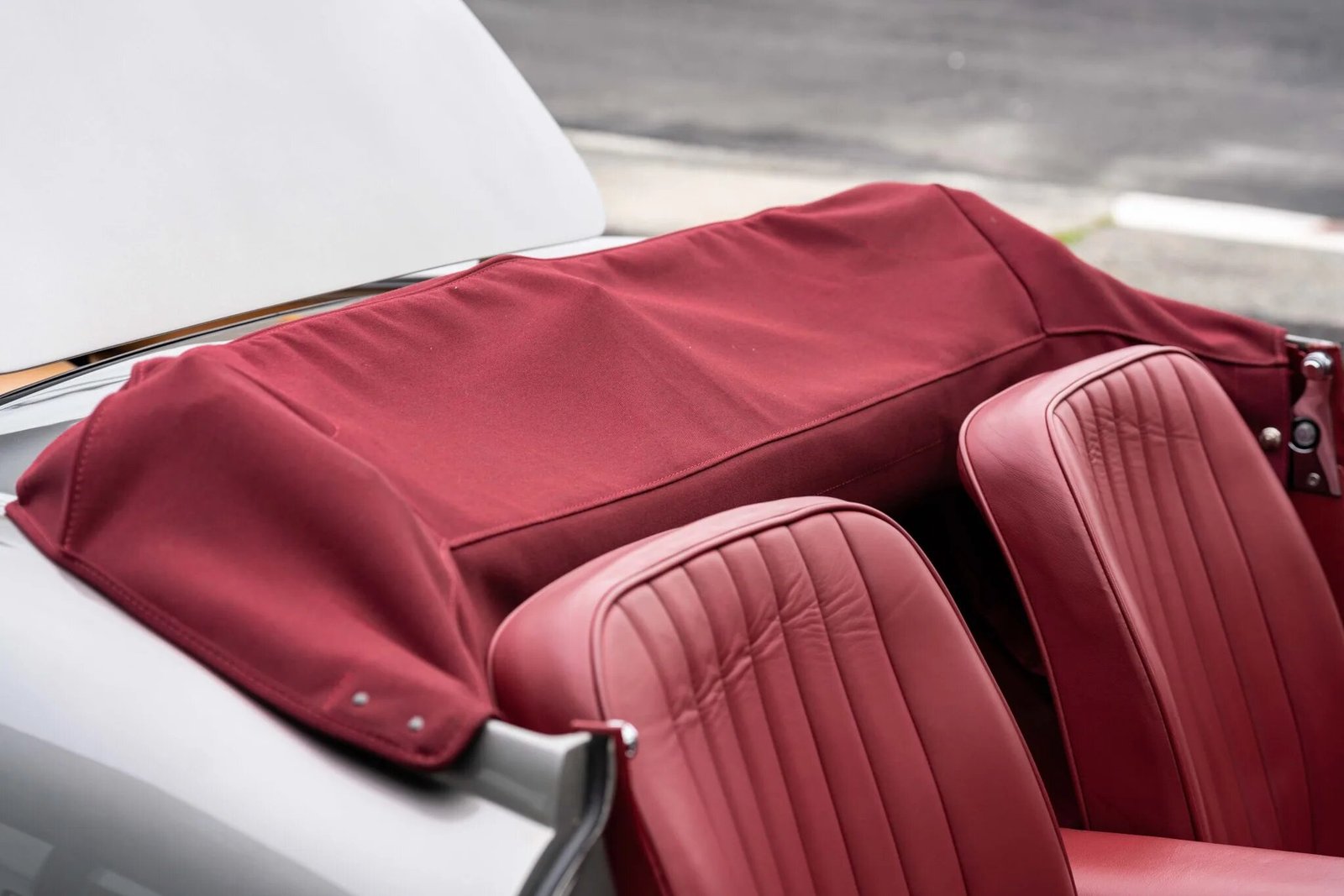 Originally trimmed in black, the cabin has been fitted with replacement bucket seats covered in burgundy leather with color-coordinated door panels and carpets.