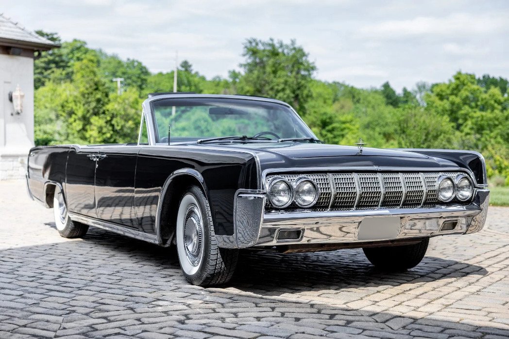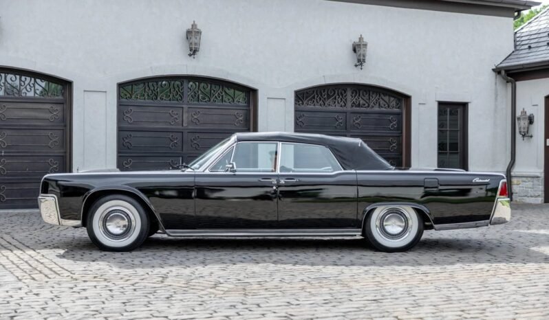 This 1964 Lincoln Continental is a triple-black convertible powered by a 430ci V8 paired with a dual-range three-speed automatic transmission. Equipment includes 15″ steel wheels, power steering, reverse-hinged rear doors, a power-operated convertible top, power-adjustable front seats, a Pioneer CD stereo, and aftermarket speakers.