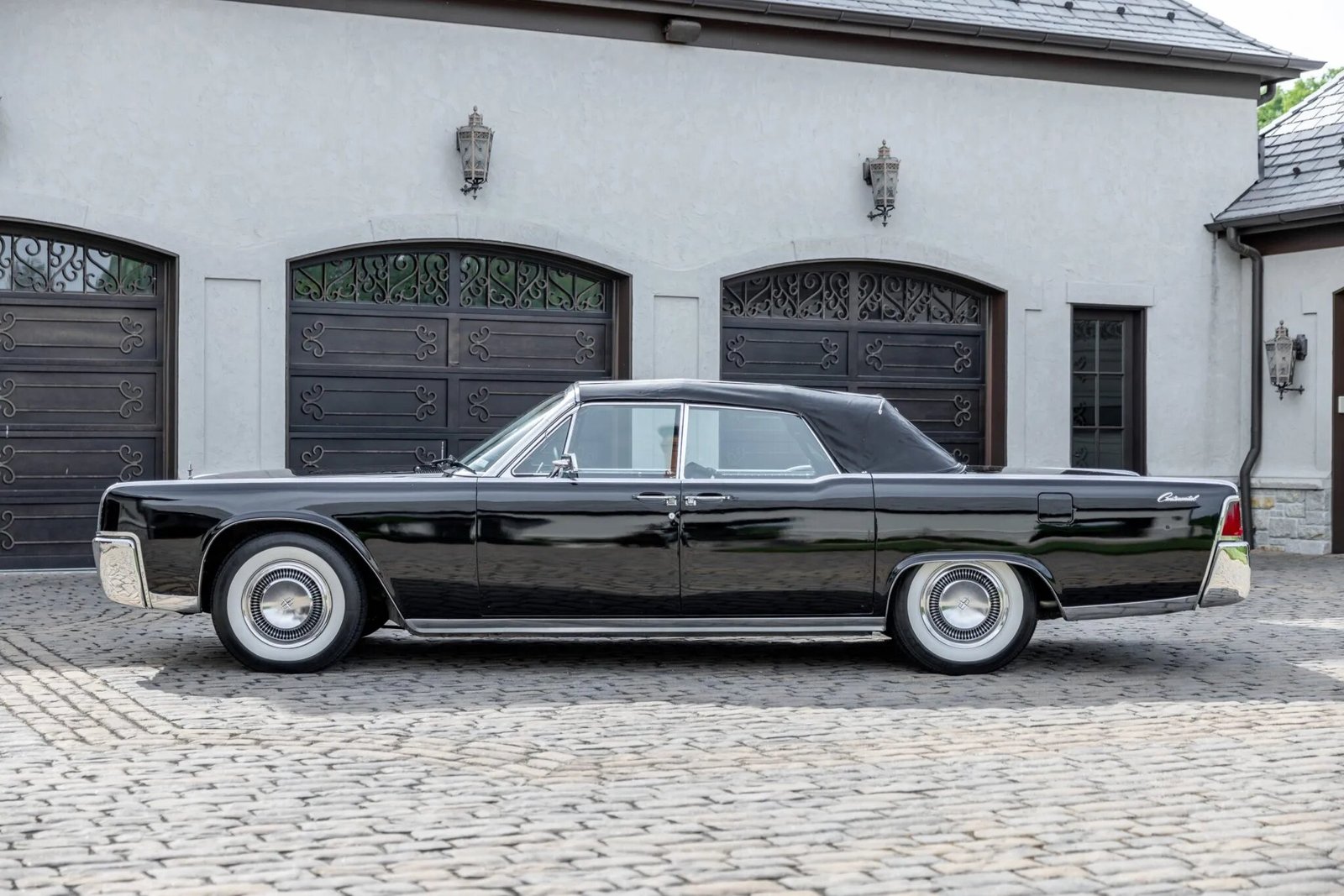 Details include a power-operated black convertible top, reverse-hinged rear doors, quadruple headlights, and chrome bumpers.
