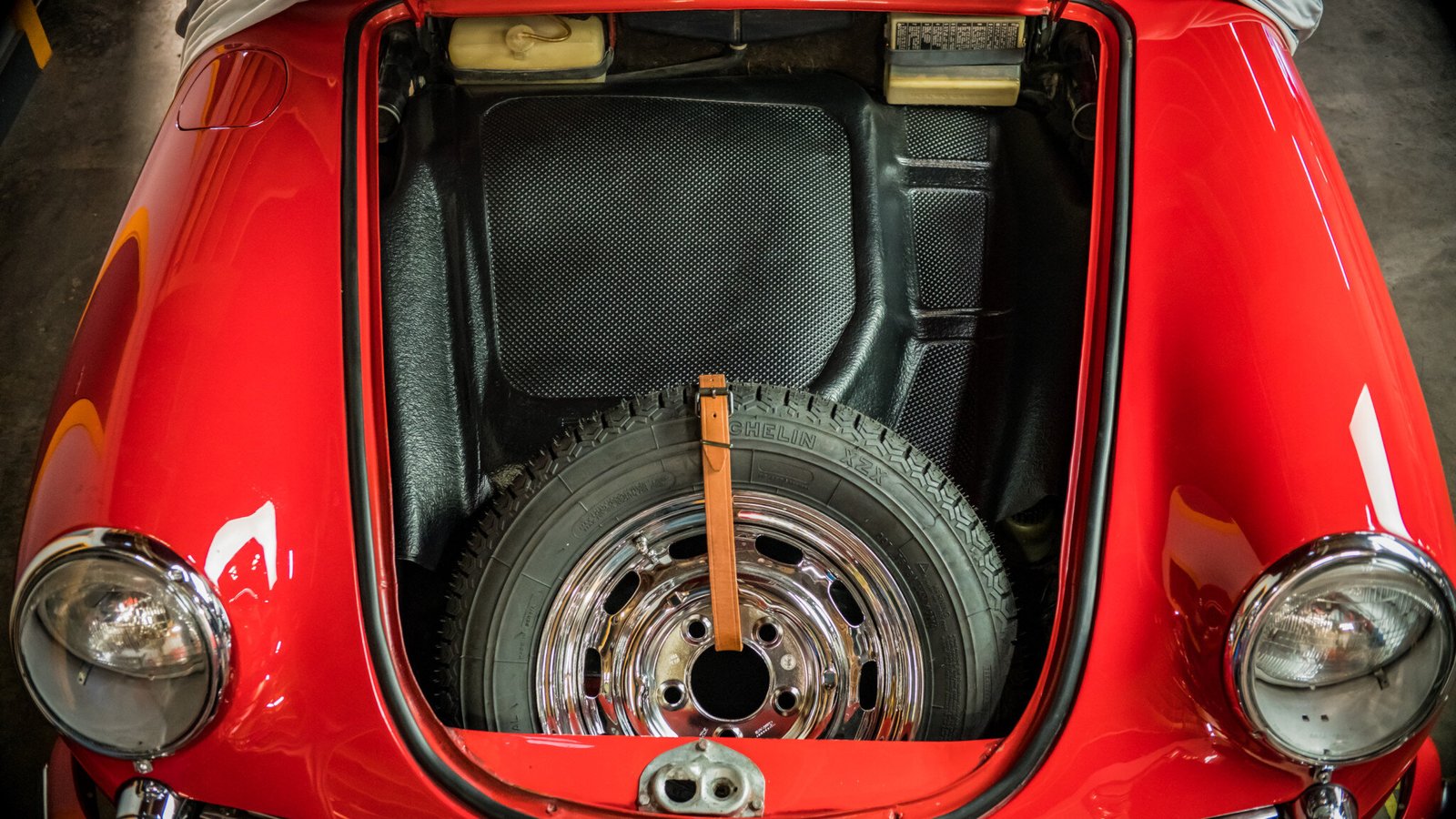 15×5.5″ chrome wheels are mounted with Michelin XZX tires, with a full-size matching spare in the front trunk. Shallow hub caps with colored Porsche crests are fitted along with the factory ATE disc brakes at all four corners.