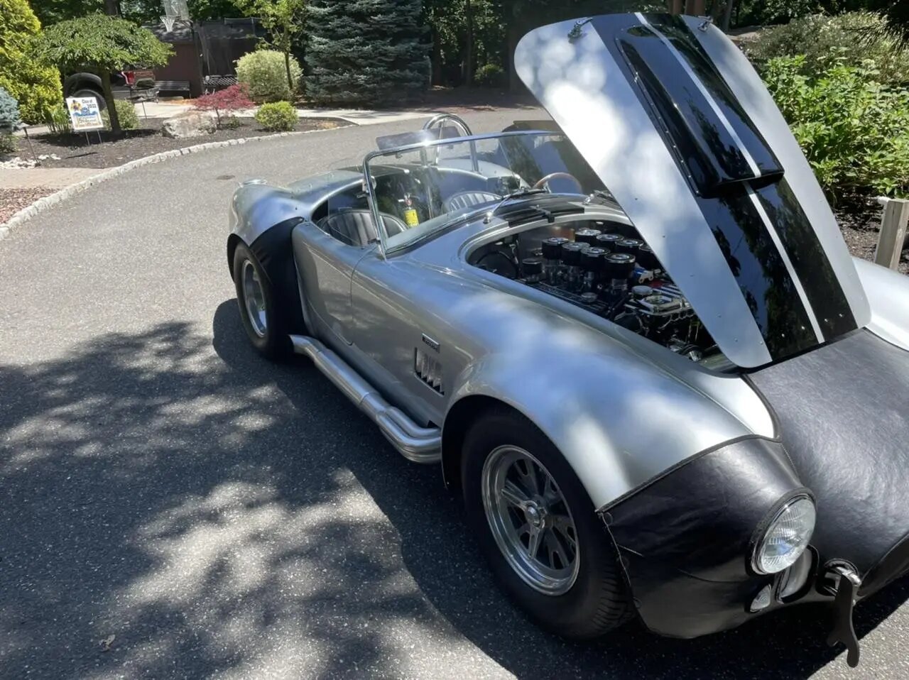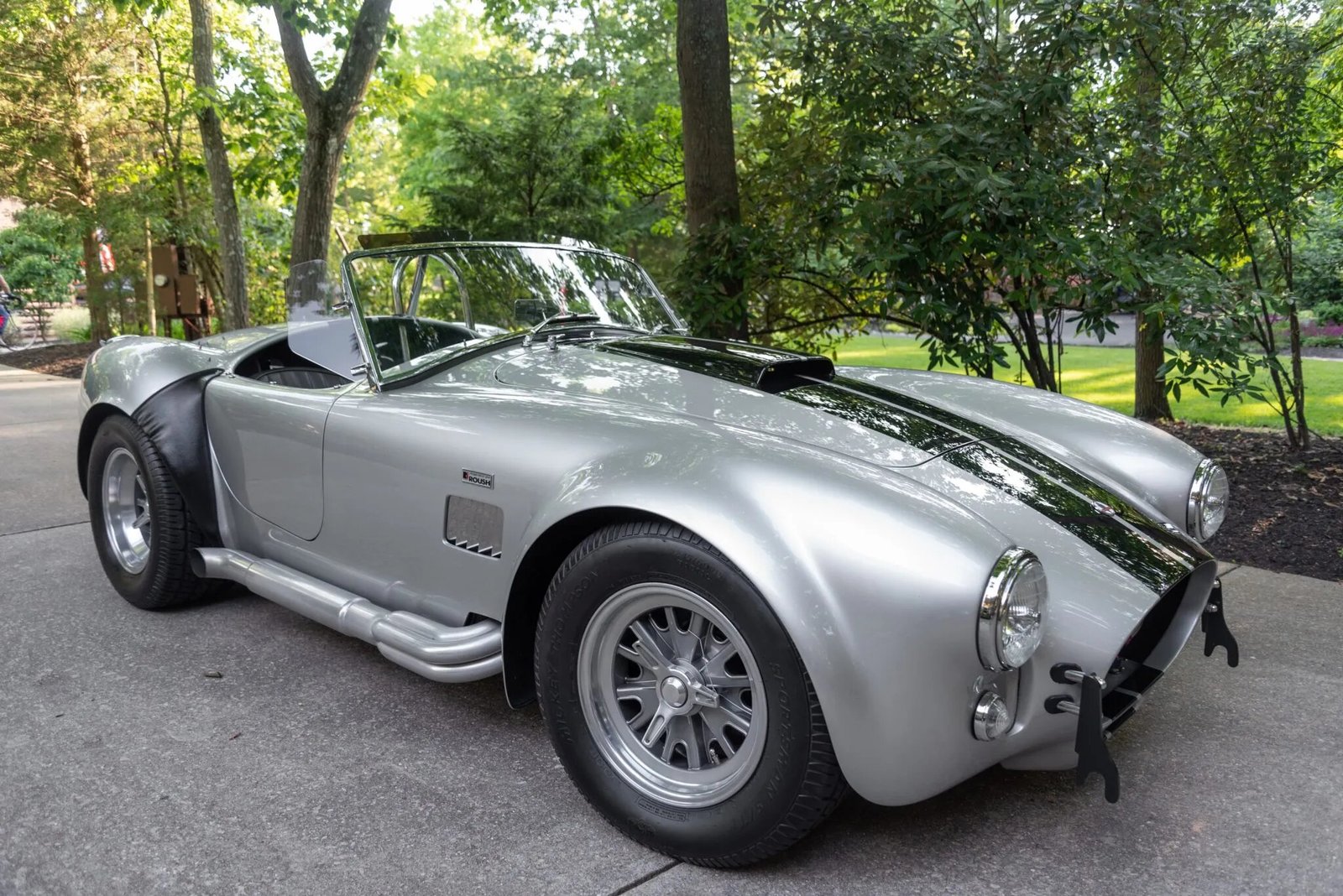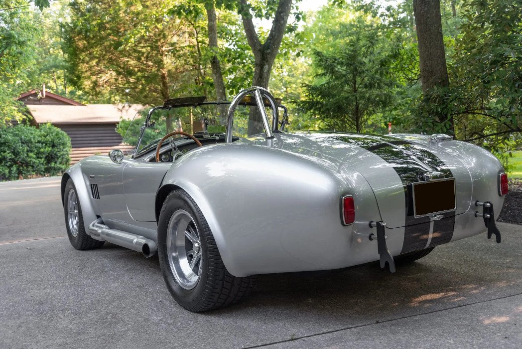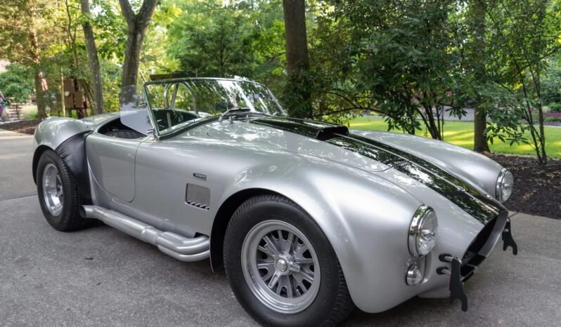 This Superformance MKIII is a Shelby Cobra replica is finished in silver over black upholstery. Power is provided by a Roush-built 402ci V8 mated to a five-speed manual transmission, and equipment includes an eight-stack fuel-injection system, Wilwood power-assisted disc brakes, adjustable coilovers, 15” Halibrand-style wheels, a chrome roll hoop, side exhaust pipes, quick-jack bumperettes, a hood scoop, a soft top, side windows, racing-style harnesses, and a wood-rimmed steering wheel.