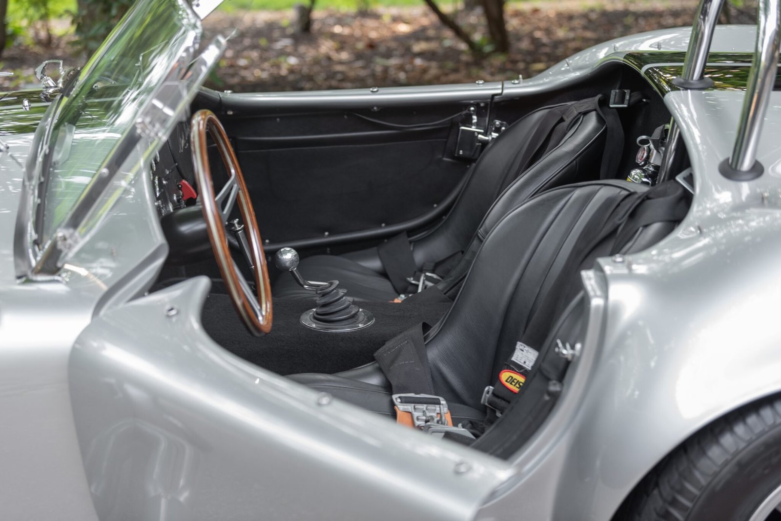 Appointments include Deist Racing harnesses, tinted sun visors, Cobra floor mats, a fire extinguisher, a dash-mounted rearview mirror, and a glovebox door with a Carroll Shelby signature.