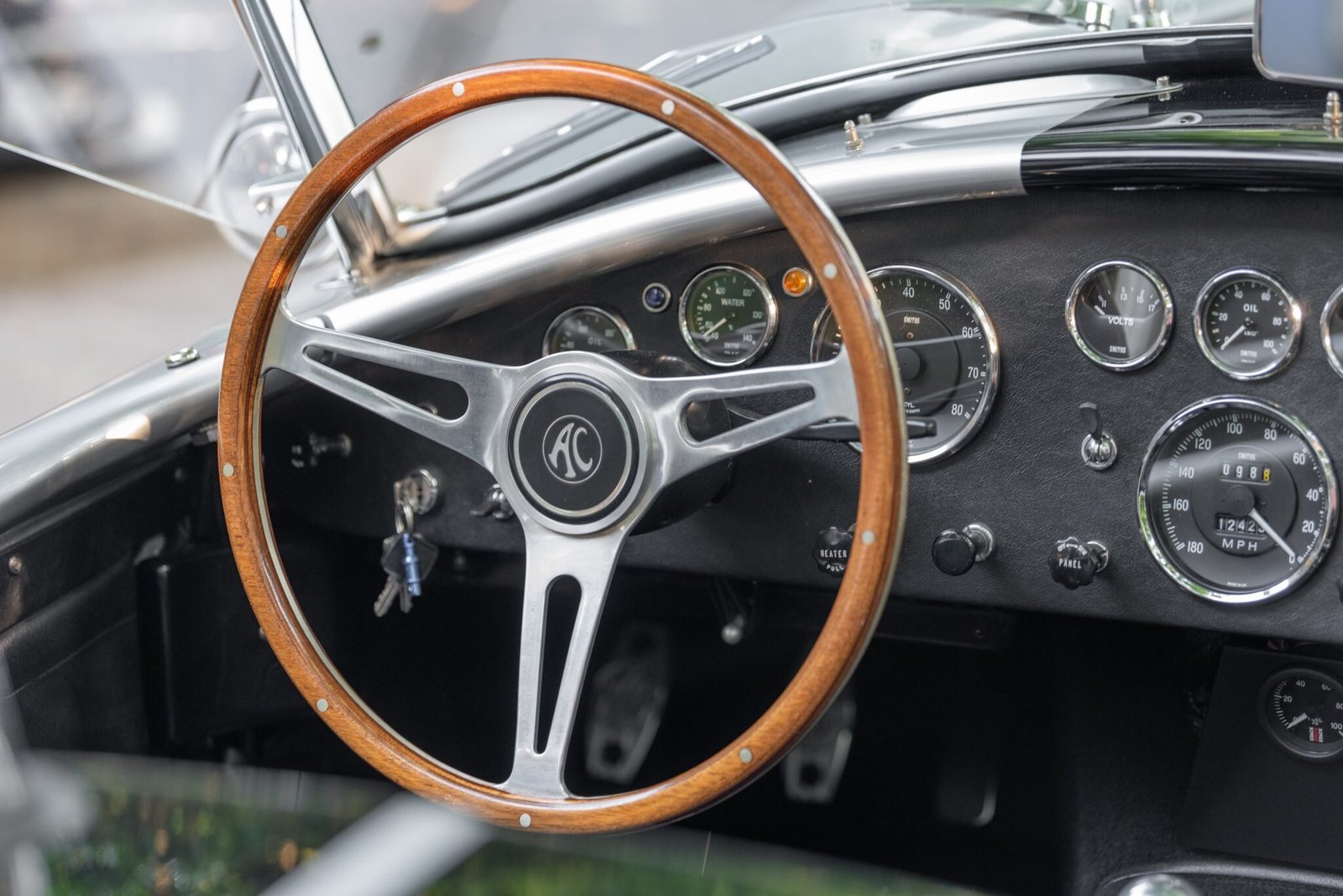 A wood-rimmed steering wheel sits ahead of Smiths instrumentation that includes a reverse-sweep 180-mph speedometer, an 8k-rpm tachometer, and auxiliary gauges.