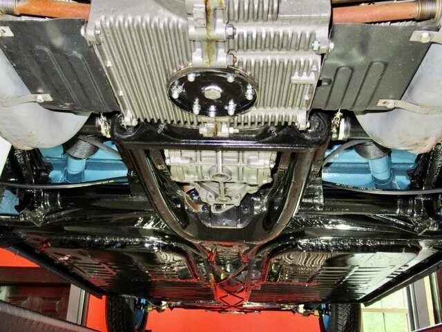 The rear floor pans were replaced during the refurbishment, and the underside surfaces have been coated with POR-15.