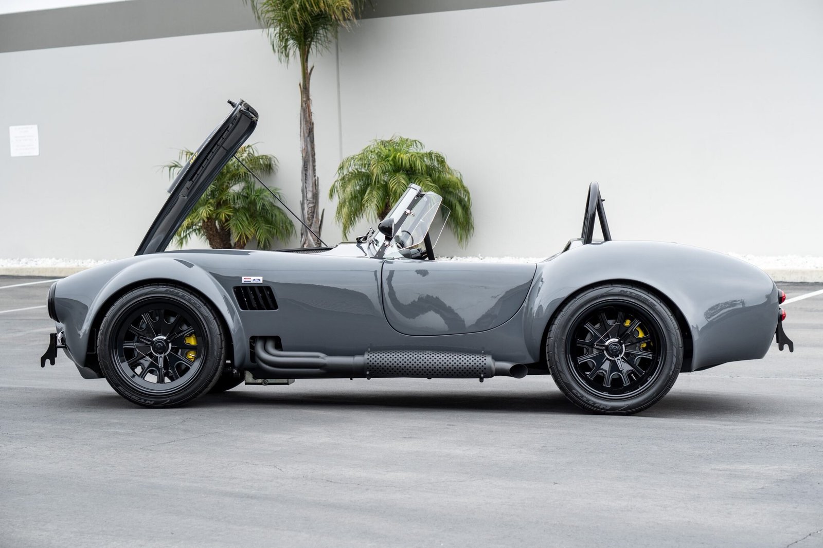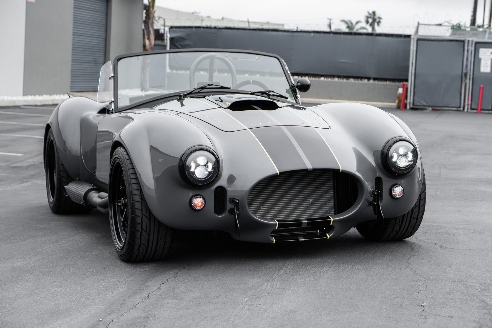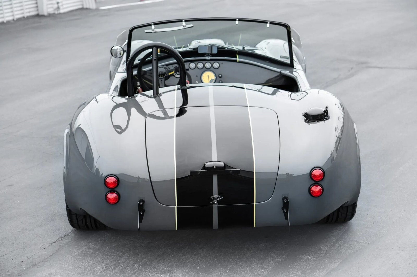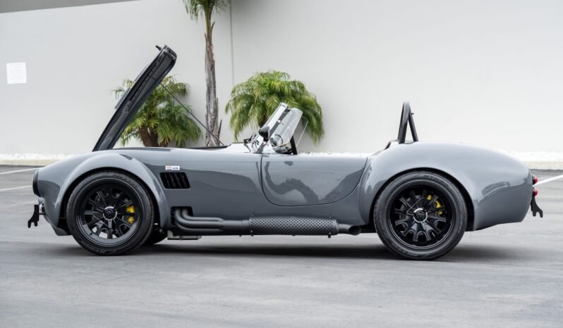 This Backdraft Racing Cobra replica was built by TR-Tec in Durban, South Africa, and is finished in gray with black stripes over black leather upholstery. The car is powered by a 427ci V8 mated to a Tremec five-speed manual transmission and a limited-slip differential, and additional equipment includes an Edelbrock intake manifold, a Holley four-barrel carburetor, an MSD distributor, Halibrand-style 18″ knock-off wheels, four-wheel disc brakes with yellow calipers, and side exhaust pipes in addition to a LeMans-style fuel cap, a roll hoop, a hood scoop, front and rear quick-jack bumperettes, LED headlights, RJS racing harnesses, a carbon-fiber dashboard housing Classic Instruments gauges, and push-button start.