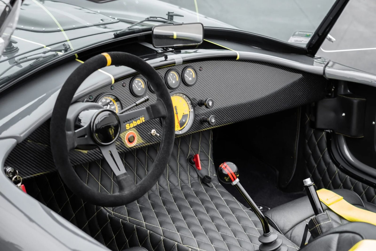 The Alcantara-wrapped Sabelt steering wheel fronts central Classic Instruments gauges including a 200-mph speedometer, a yellow-dialed 10k-rpm tachometer, and auxiliary readouts for oil pressure, coolant temperature, fuel level, and battery voltage.