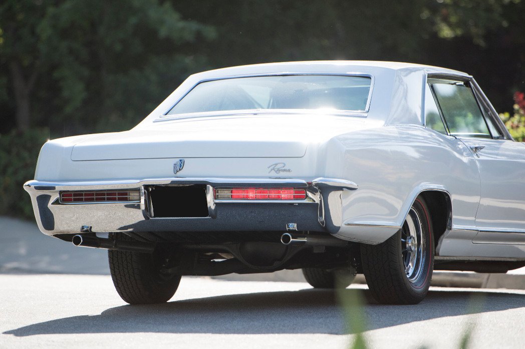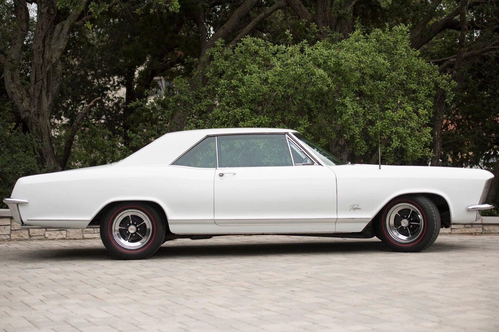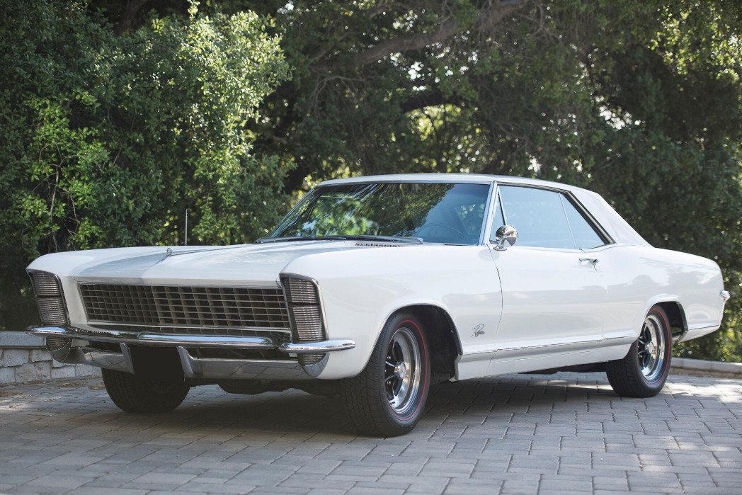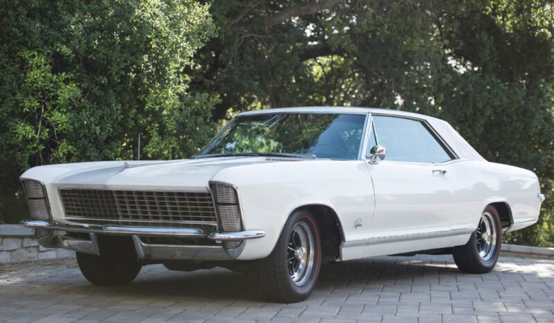 This 1965 Buick Rivera is finished in Arctic White over a black vinyl interior. The car is powered by a 425ci V8 paired with a 3-speed automatic transmission, and equipment includes power windows, air conditioning, a rear seat speaker, seat belts with retractors, and EZI glass. Maintenance completed in preparation for sale consisted of a tune-up, transmission service, front shocks, rear air shocks, new tires, and more.
